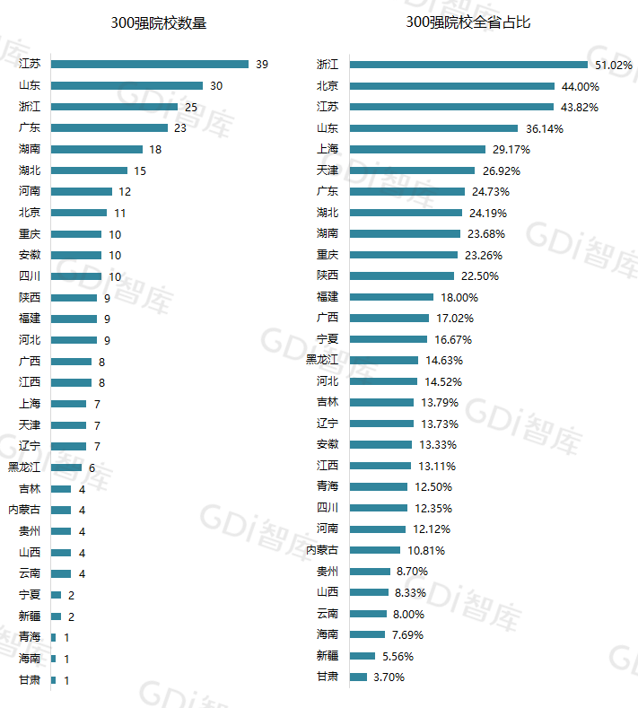 在“GDI高职高专(公办)TOP300榜(2022)”中,江苏有39所,数量位居第一,排名第二至第五位的情况如下:山东30所,浙江25所,广东23所,湖南18所。