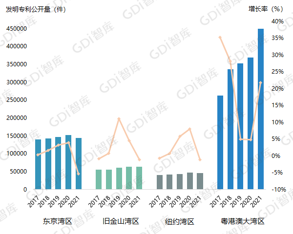 数据显示,2017-2021年粤港澳大湾区发明专利公开总量176.90万件,年复合增长率达14.46%,位列四大湾区首位,创新态势强劲。2021年粤港澳大湾区发明专利公开量增长21.74%,达44.96万件,为东京湾区的3.11倍,旧金山湾区的7.07倍,纽约湾区的9.66倍。