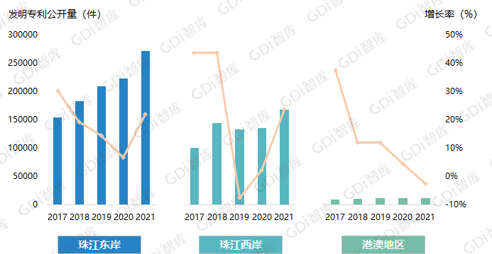 2017-2021年,珠江东岸发明专利公开量103.83万件,珠江西岸67.80万件,港澳地区5.27万件。广州、深圳、珠海和东莞四地近五年发明专利公开量稳定增长。