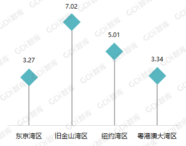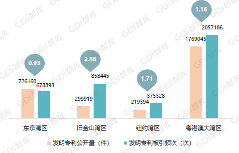 《报告》用专利被引频次与专利公开量的比值来衡量该湾区发明专利的质量,比值越高表明该湾区的专利质量越高,专利越具有价值。
