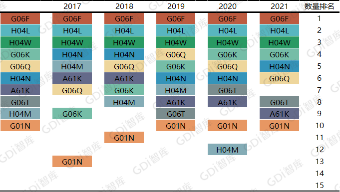 粤港澳大湾区近五年发明专利公开总量排名前10位的分别为G06F(电数字数据处理)、H04L(数字信息的传输)、H04W(无线通信网络)、G06K(数据识别、处理)、G06Q(专门适用于行政、商业、金融、管理、监督或预测目的的数据处理系统或方法)、H04N(图像通信)、A61K(医用、牙科用或梳妆用的配制品)、G06T(一般的图像数据处理或产生)、H04M(电话通信)、G01N(化学或物理测试、测量)。