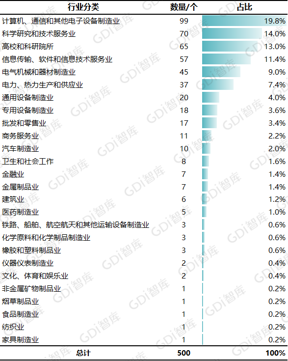 《报告》依据国民经济行业分类标准GB/T 4754—2017对粤港澳大湾区TOP500优势创新机构样本(下简称“优势创新机构”)中的企业行业进行归类,入选企业样本的行业共10个类别,主要集中在第二、第三产业:制造业,科学研究和技术服务业,信息传输、软件和技术服务业,电力、热力生产和供应业,批发和零售业,商务服务业,卫生和社会工作,建筑业,金融业以及文化、体育和娱乐业。优势创新机构中,除企业外,还有多个高等院校、科研院所,对其统一设置为“高校和科研院所”。
