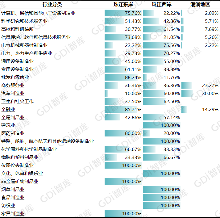 电子信息相关领域的创新要素在珠江东岸的集聚效应较为明显,大湾区99家计算机、通信和其他电子设备制造业的优势创新机构中,75家(占比75.76%)位于珠江东岸。大湾区57家信息传输、软件和信息技术服务业的优势创新机构中,42家(占比73.68%)位于珠江东岸。大湾区70家优势科学研究和技术服务创新机构中,广州和深圳共50家,占71.43%。65家高校和科研院所的优势创新机构中,珠江西岸40家,占比61.54%,其中29家位于广州。珠江西岸入选的6家汽车制造业机构中,4家位于广州,广州汽车制造业持续发力,自主研发,创新能力不断增强。
