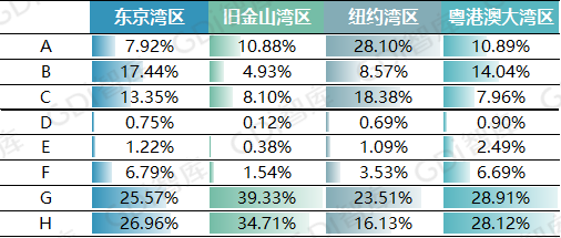 从发明专利行业分布来看,粤港澳大湾区行业结构与旧金山湾区、东京湾区类似,重点发展G类(物理)和H类(电学),其次A类(人类生活必需品)、B类(作业、运输)、C类(化学、冶金)同样为热门创新领域。纽约湾区发明专利重点领域分布较为均匀,以A类(人类生活必需品)、G类(物理)、C类(化学、冶金)、H类(电学)为主。