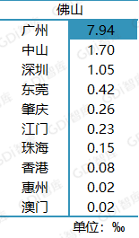 佛山与广州跨城合作专利率最高,达7.94‰。两地专利合作领域主要集中在电磁测量、数据处理系统或方法、电路装置、电能存储、电数字数据处理和医用、牙科用或梳妆同的配制品等领域,展现广佛优势互补、资源共享的协同创新发展趋势。