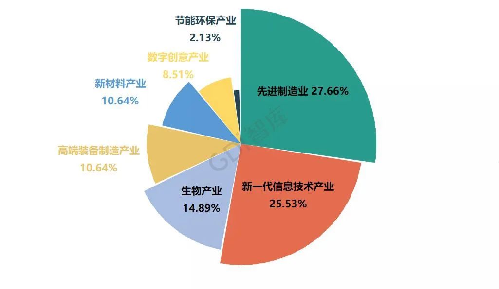 先进制造业和新一代信息技术产业上榜企业数量占比超过50%,分别为13家(占比27.66%)、12家(占比25.53%)。其次是生物产业,有7家企业上榜,占比14.89%。