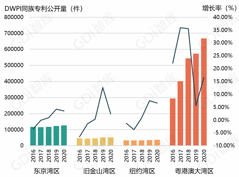 数据显示,粤港澳大湾区2016-2020年发明专利公开量达149.84万件,远超其他三大湾区,年复合增长率达17.23%。