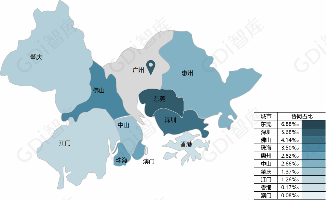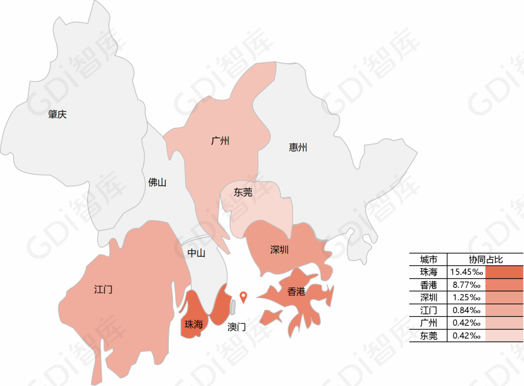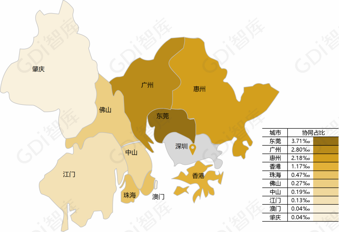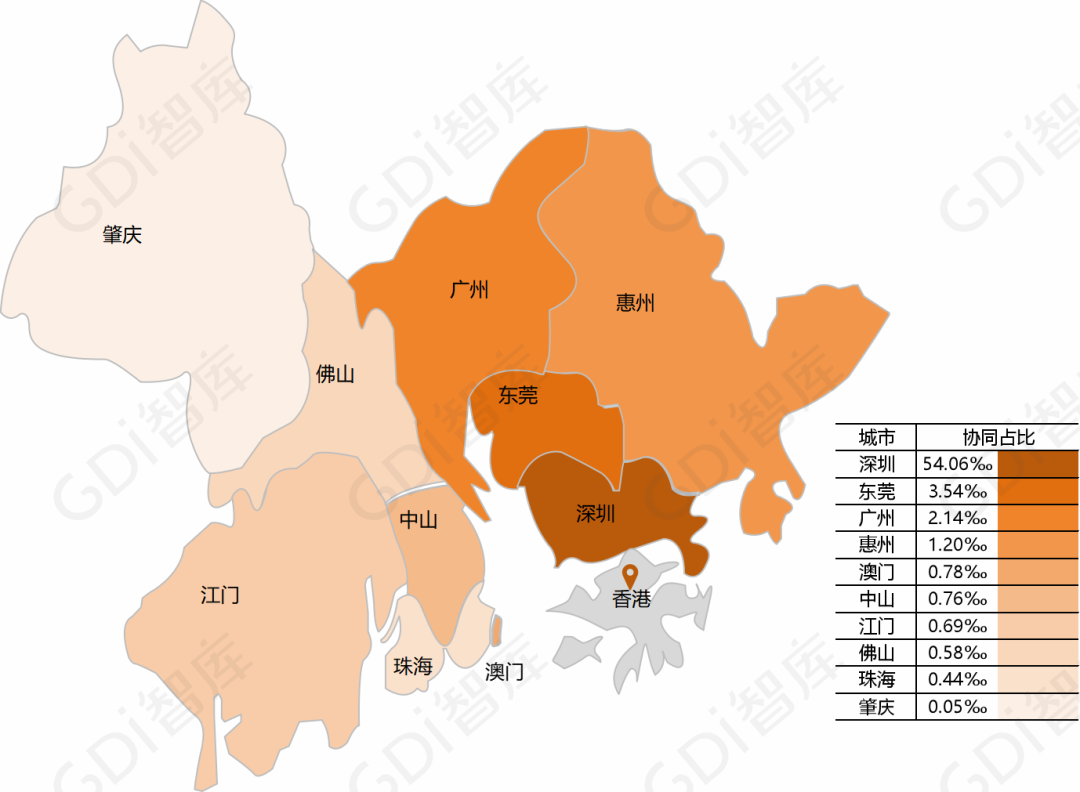 东莞是粤港澳大湾区内与深圳协同合作最为密切的创新城市,两地跨城市专利合作率为3.71‰,照明装置、无线通信网络、电数字数据处理等是两地专利合作的主要方向,合作涉及电子信息技术、互联网、基本电气等领域,展现两地在发展定位和产业布局方面优势互补的创新趋势。