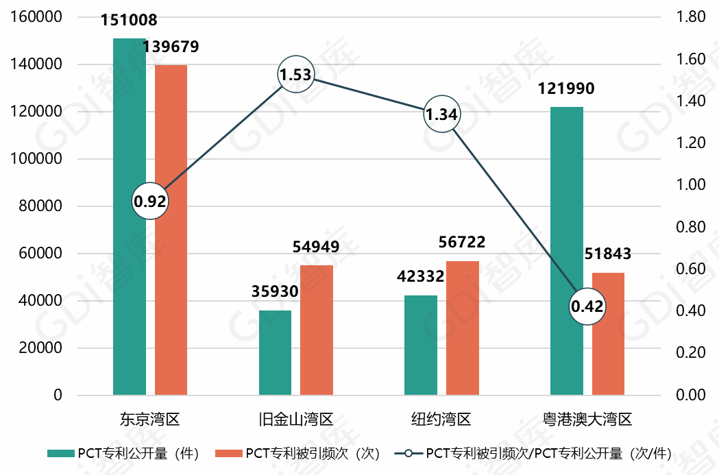 从PCT专利影响力来看,粤港澳大湾区比值为0.42,东京湾区比值为0.92,旧金山湾区和纽约湾区比值分别为1.53和1.34。粤港澳大湾区PCT专利公开量逐年递增,但专利影响力与旧金山湾区和纽约湾区存在较大的差距。