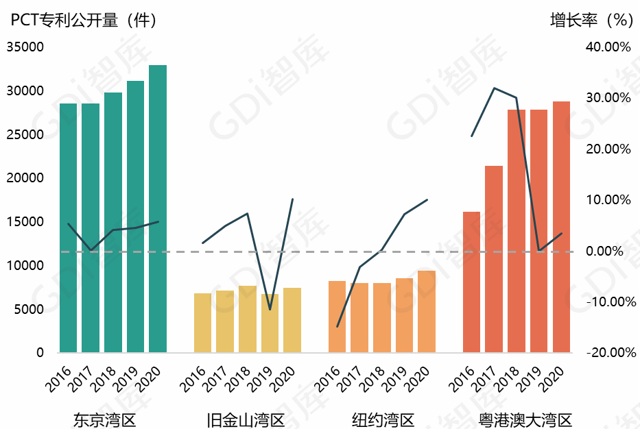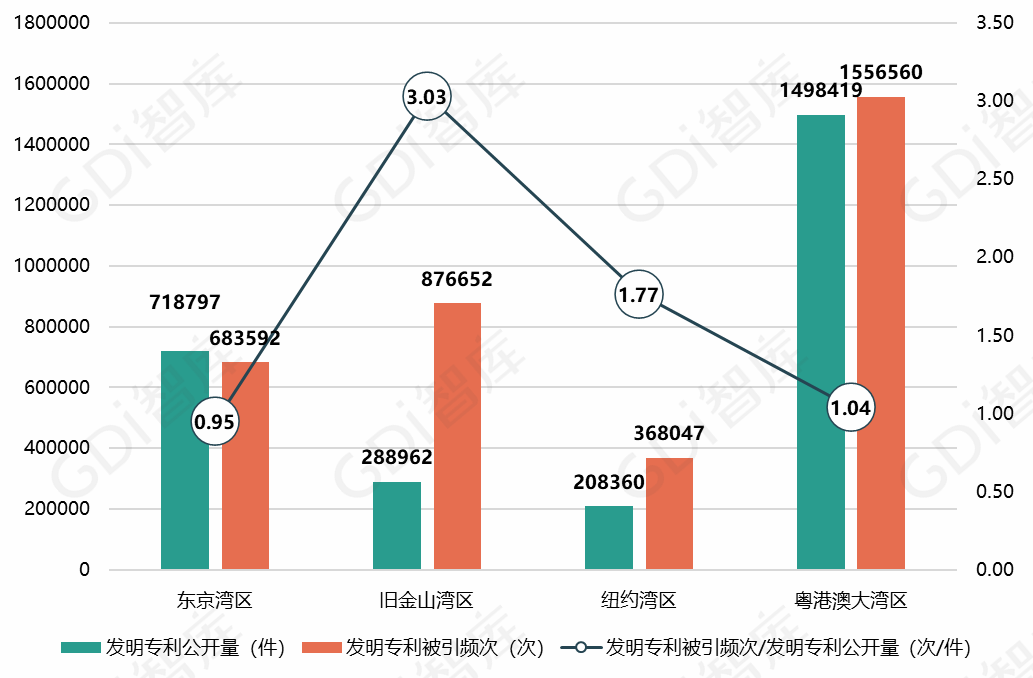 2020年粤港澳大湾区发明专利公开量约36.59万件,为东京湾区的2.39倍,旧金山湾区的5.73倍,纽约湾区的7.85倍。