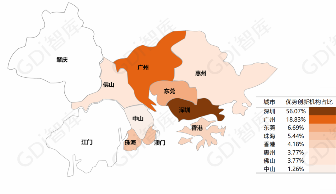 广州和深圳是粤港澳大湾区高校和科研院所创新机构的主阵地,占比近七成,其中广州的科研优势最为突出。