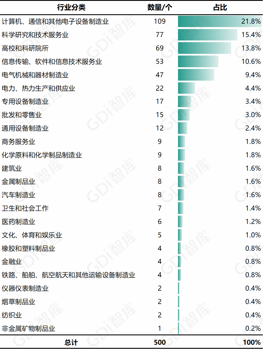 2016-2020年间的TOP500优势创新机构中,77个科学研究和技术服务业企业以及69个高校和科研院所入选本期优势创新机构,与“计算机、通信和其他电子设备制造业”(109个)位列前三名。紧随其后的信息传输、软件和信息技术服务业有53个机构入选本次的优势创新机构,占比10.6%。