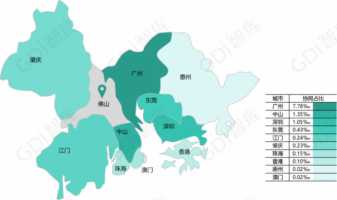 广州是粤港澳大湾区内与佛山协同合作最为密切的创新城市,两地跨城市专利合作率为7.78‰,测量测试、计算、数据处理系统和方法、电路装置、电数字数据处理、医用配制品、医用药剂、供热或通风系统应用等是两地专利合作的主要方向,合作涉及信息技术服务、科学研究和技术服务、电气机械和器材制造、医药制造等多个领域,展现广佛优势互补、资源共享的协同创新发展趋势。