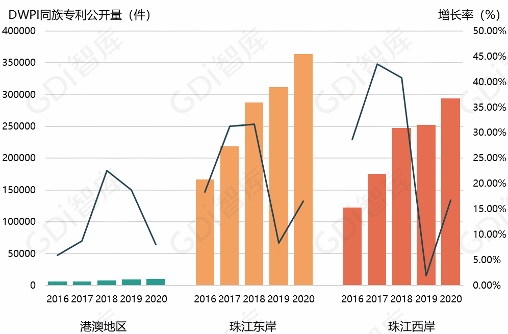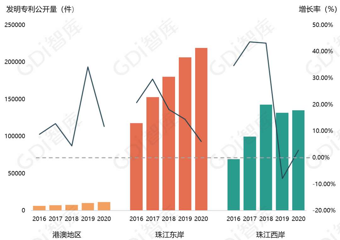 2016-2020年,珠江东岸发明专利公开量约87.68万件,珠江西岸约57.87万件,港澳地区约4.30万件。广州、深圳、珠海、东莞和香港发明专利公开量近五年均保持正增长。