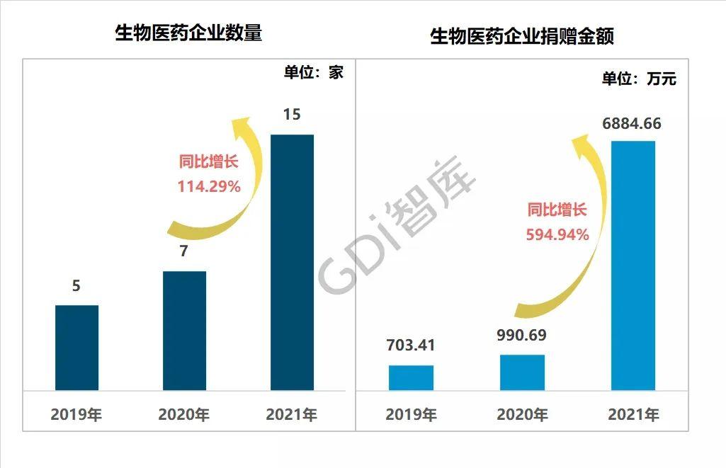 2021年12月,GDI智库发布“粤港澳大湾区企业社会责任影响力(广州)TOP100榜”,关注粤港澳大湾区社会责任成效,展示慈善事业在推动高质量发展、促进共同富裕中的作用、担当。共有15家生物医药企业上榜,同比增长114.29%;捐赠总额6884.66万元,同比增长594.94%。广药集团、香雪制药连续三年上榜,金域医学连续两年上榜。