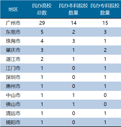 表 广东各区民办高校数量