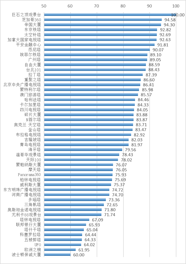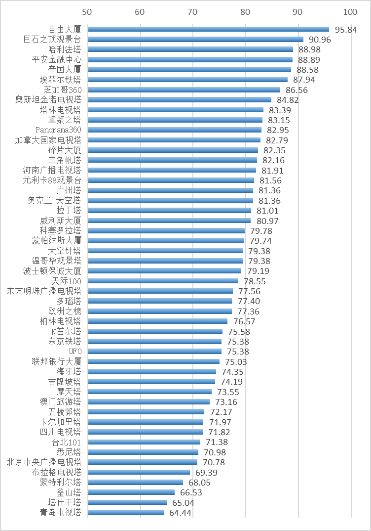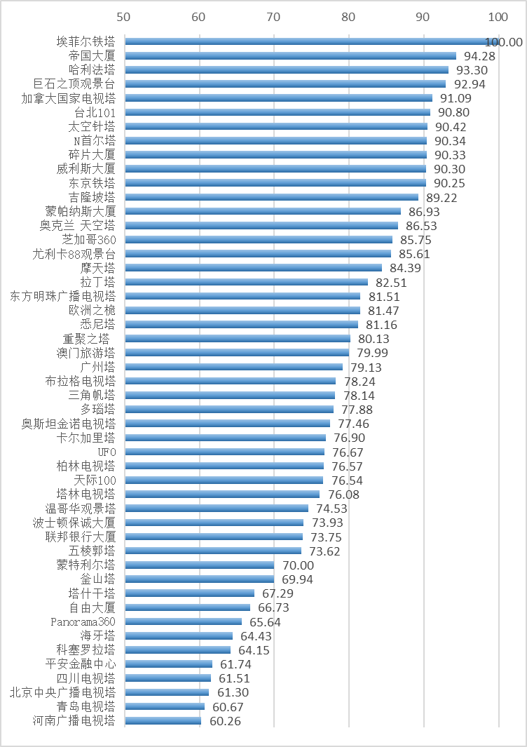 关联度指数得分介于60~100,得分越高,代表高塔在有关其所在城市的媒体报道中同时被提及的频率越高,则高塔与所在城市的关联度越高。
