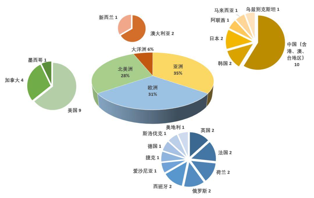 从分布国家和地区分析,亚洲17座共分布在9个国家和地区,其中中国(含香港特别行政区、澳门特别行政区以及台湾地区)有10座,数量位居第一。