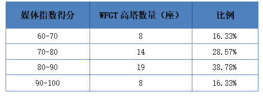 该指数得分介于60~100,分值越大,媒体报道数量越多,品牌传播力越大。WFGT高塔的媒体指数得分主要集中在80~90之间,占比超过四成;其次,有14座的得分介于70~80,占比28.57%;媒体指数介于60~70分和超过90分的均有8座,各占16.33%。