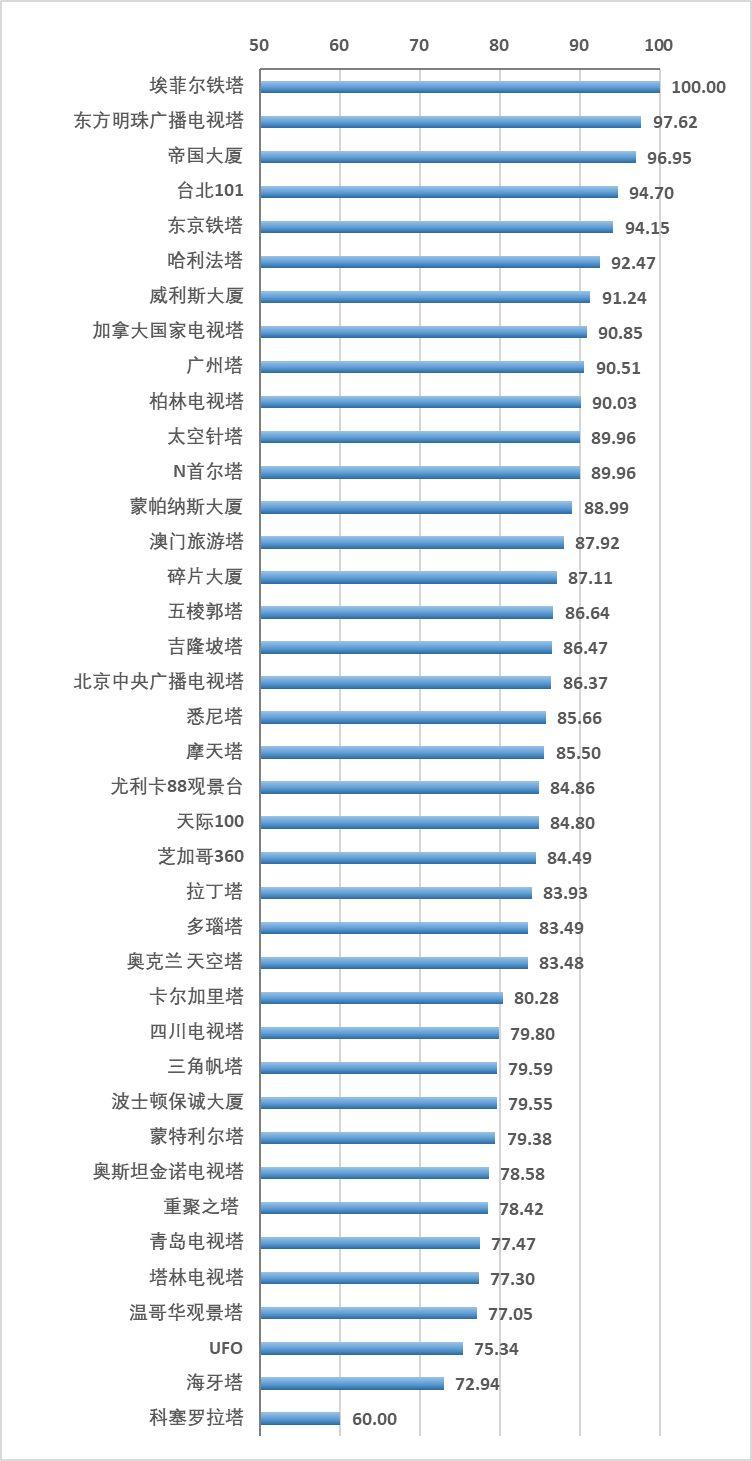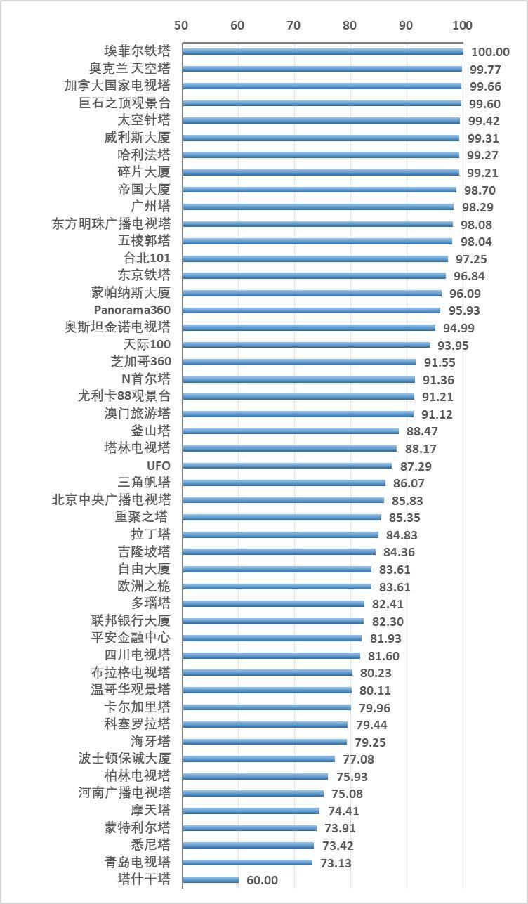 数据显示,49座成员塔当中有8座在所在城市景点排名高居前1%,占高塔总数约16%,依次为:埃菲尔铁塔、奥克兰天空塔、加拿大国家电视塔、巨石之顶观景台、太空针塔、威利斯大厦和哈利法塔和碎片大厦。