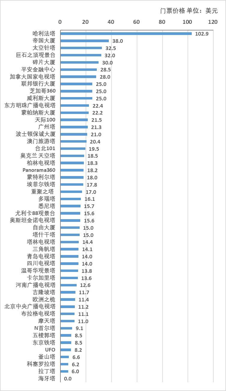 49座高塔门票价格的平均水平为18.8美元;标准差系数76%,高塔间门票价格差异较大:门票价格最高为哈利法塔,约102.9美元;门票价格最低为海牙塔0美元,即对公众免费开放。超五成高塔的门票价格集中在10~20美元;其余高塔门票价格分布在10美元以下、20~30美元以及30~40美元三个区间。