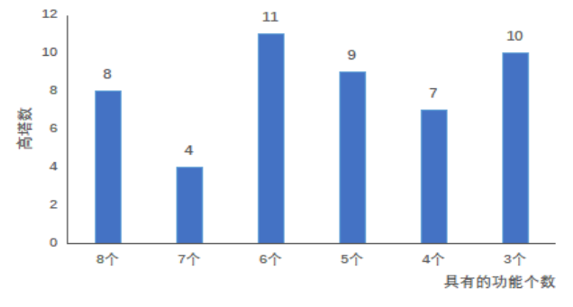 据统计,高塔拥有功能个数介于3~8项之间,平均每座高塔拥有功能个数约为5项;拥有6项功能的高塔最多,约占总数22%,其次是拥有3项功能的高塔,约占两成;拥有7项功能的高塔数量最少,占比8%。