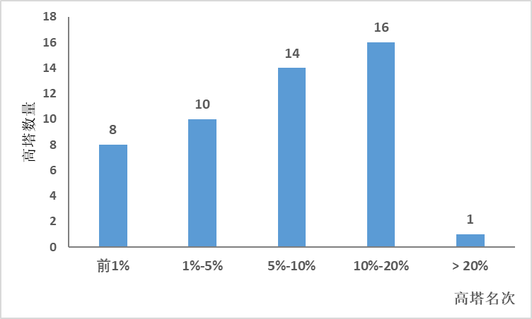 排名介于1%~10%的高塔共占近五成,其中广州塔、五棱郭塔和台北101大厦其绝对值排名位于前十。