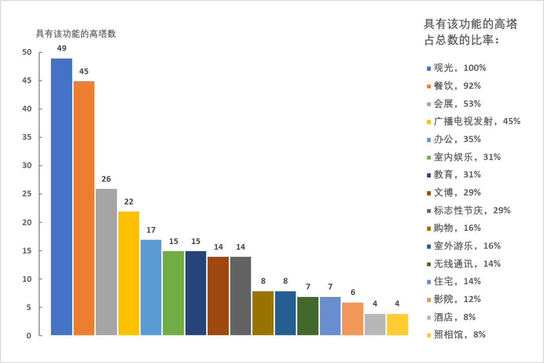 拥有广播电视发射或无线通讯功能的高塔合计占比近六成,主要为广播电视塔,如广州塔、上海东方明珠广播电视塔、加拿大国家电视塔等。35%的高塔拥有办公功能,22%的高塔拥有住宅或酒店功能,主要为大厦类建筑,如帝国大厦、哈利法塔、尤利卡88观景台、芝加哥360、海牙塔等。