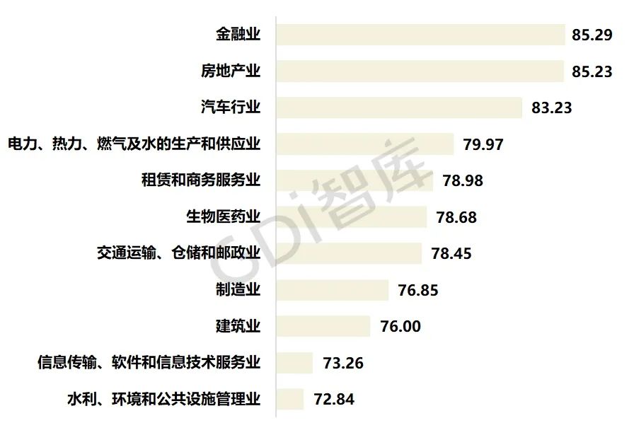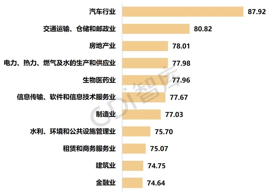 上市企业品牌影响指数位列前三的行业是汽车行业,交通运输、仓储和邮政业,房地产业,品牌影响指数平均指数分别为87.92,80.82和78.01。上榜11个行业平均品牌影响指数为77.46。