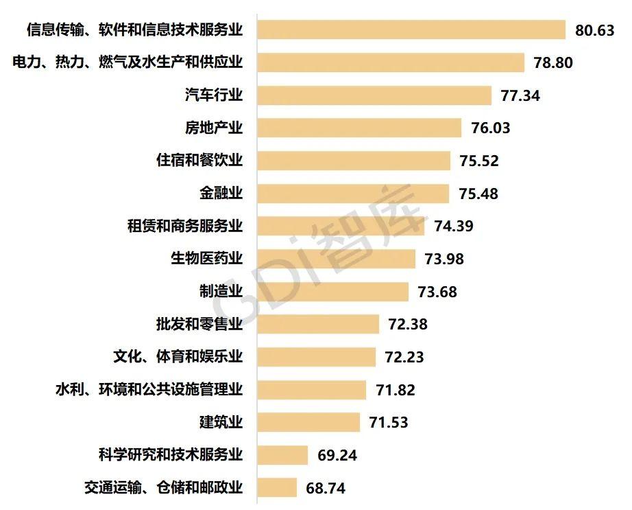 品牌影响指数位列前3的行业是信息传输、软件和信息技术服务业,电力、热力、燃气及水生产和供应业,汽车行业,平均指数分别为80.63,78.80和77.34。属于信息传输、软件和信息技术服务业的多益网络、佳都科技等上榜企业,在媒体曝光量、新闻报道和美誉度上表现较为突出。