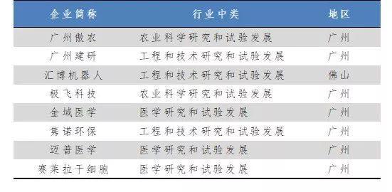 研究和试验发展包含自然科学研究和试验发展等5个领域,本次入榜的8家研究和试验发展企业涵盖其中的3个领域,其中工程和技术研究和试验发展、医学研究和试验发展各有3家,农业科学研究和试验发展有2家。其中广州有7家企业上榜,佛山有1家。