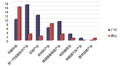 在新材料产业中,广州和佛山上榜企业数量较为均衡,分别有6家和8家企业。在节能环保产业、新一代信息技术产业、生物产业和高端装备制造产业中,两地上榜企业数量差异较大,产业互补性强。