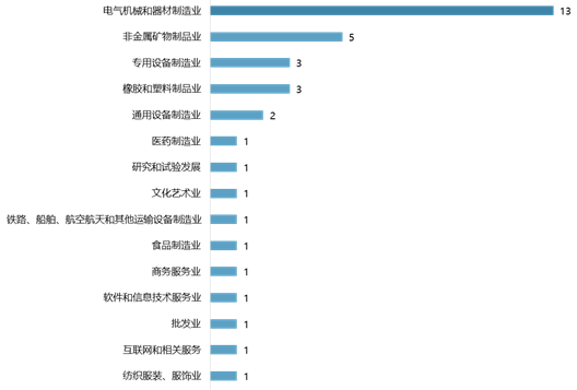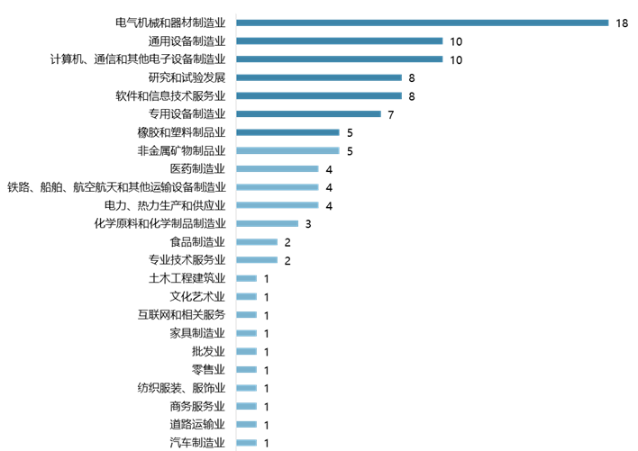 其中电气机械和器材制造业最多,共有18家。其次是通用设备制造业和计算机、通信和其他电子设备制造业企业,分别有10家企业上榜。