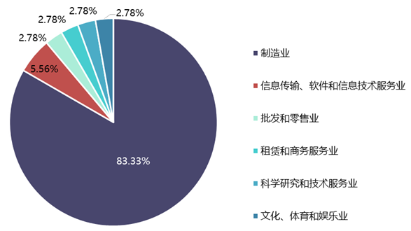 本次榜单共有36家佛山企业上榜,平均专利发明总量数1784.56件,平均专利授权率20%。上榜的36家企业分别隶属于六个行业门类,其中制造业占比高达83.33%。