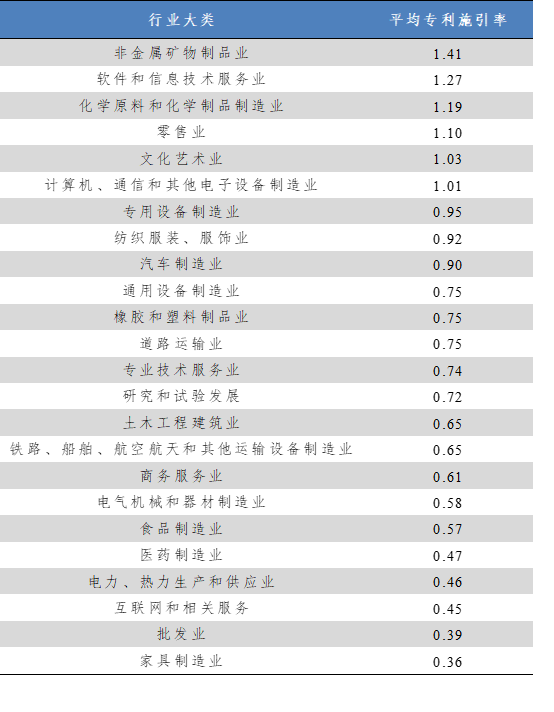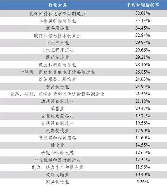 本次100家上榜企业的平均专利授权率为21.7%,上榜企业所属行业平均专利授权率如表5-1所示。