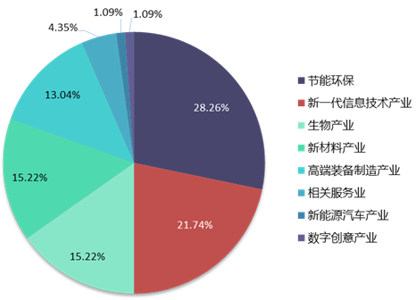 国家统计局以现行国民经济行业分类为基础,对其中符合“战略性新兴产业”特征的有关活动进行再分类,制定了《战略性新兴产业分类(2018)》。根据该分类,本次入榜的100家企业中,有92家企业从属于战略性新兴产业,这些企业覆盖了全部9大产业领域。企业从属产业占比最大的是节能环保产业,共计26家企业,占28.26%。所占比重由大至小的产业依次为新一代信息技术产业(20家)、生物产业(14家)、新材料产业(14家)、高端装备制造产业(12家)、相关服务业(4家)、新能源汽车产业(1家)和数字创意产业(1家)。