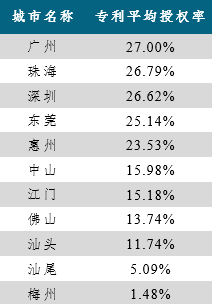专利授权率能够在一定程度上体现出专利申请的质量。百强榜企业专利授权率平均值为23.97%,其中广州、珠海、深圳、东莞、惠州五市专利平均授权率均超过20%。