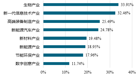 专利授权率是企业在一定时段内发明创新质量的体现,反映技术创新价值的含量。同时,不同产业因技术性质差异,在专业授权率上具有较强的产业特征。本次上榜企业中,专利授权率居前三位的产业为生物产业、新一代信息技术产业和新材料产业,专业授权率依次为33.9%、32.1%和30.4%。