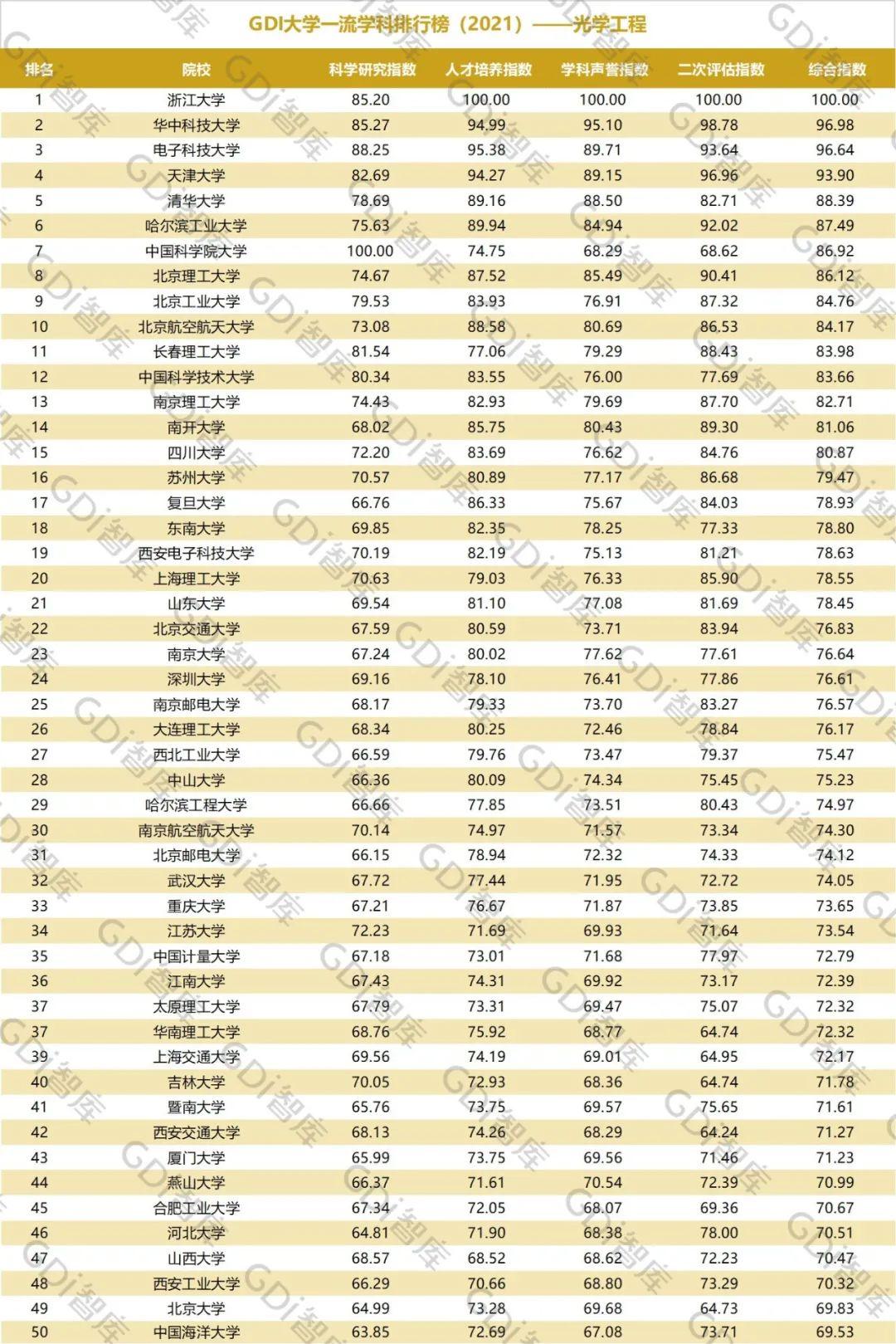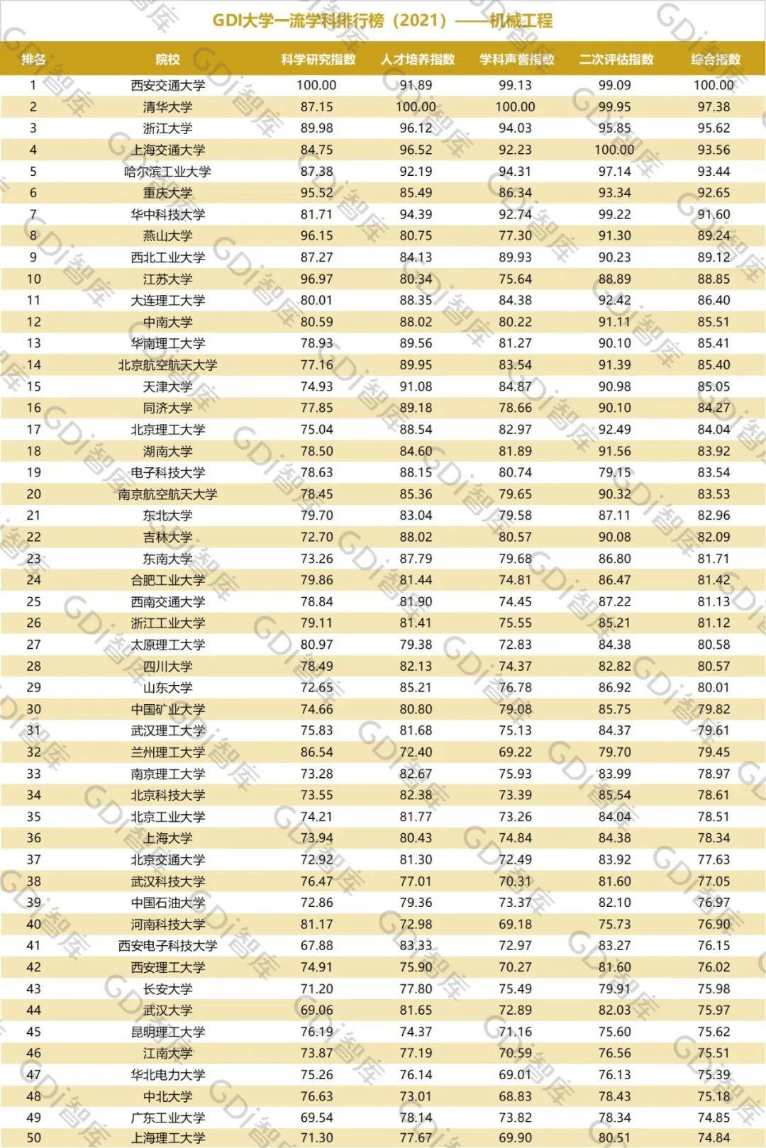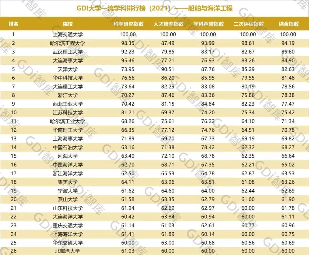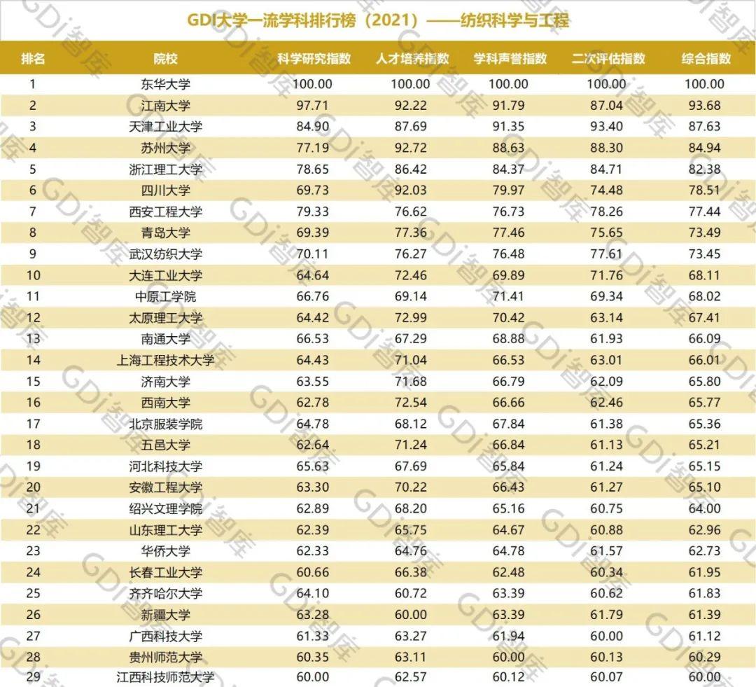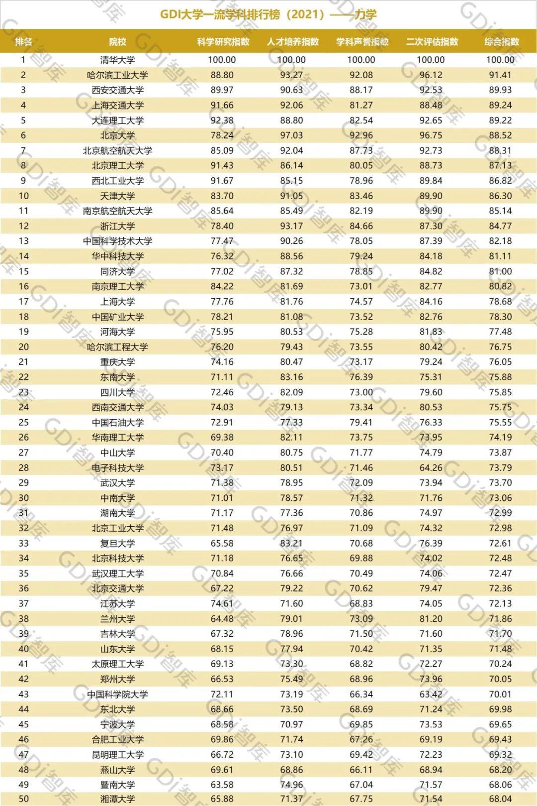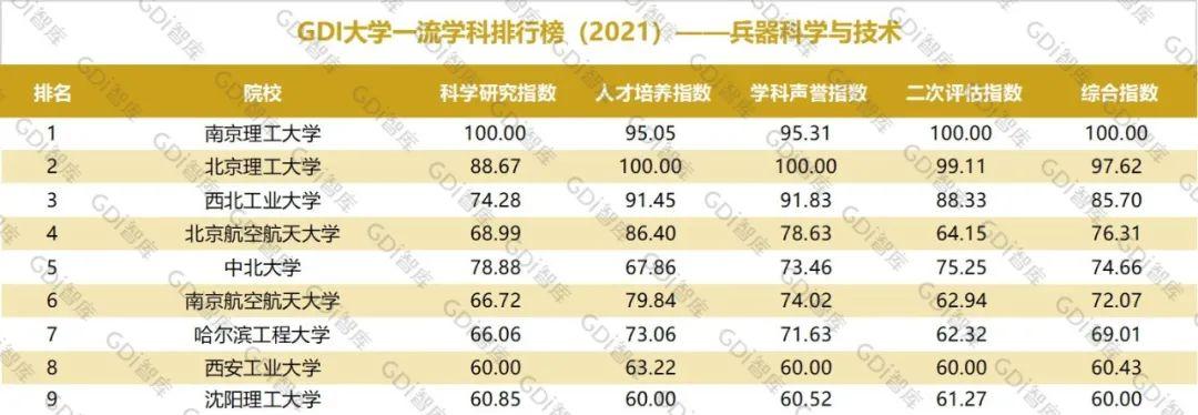 2021年6月15日,GDI智库发布“GDI大学一流学科排行榜(2021)”,通过科学研究指数、人才培养指数、学科声誉指数和二次评估指数四大一级指标科学评价518所院校的90个学科,艺术类学科不在本次评价范围。