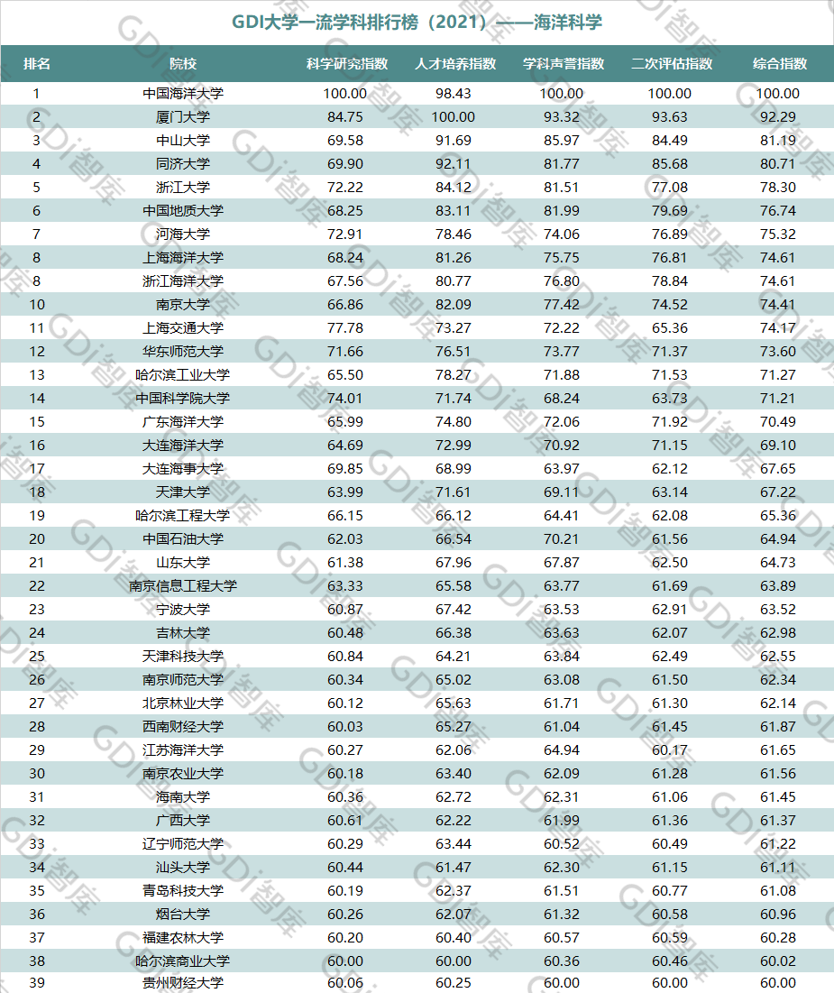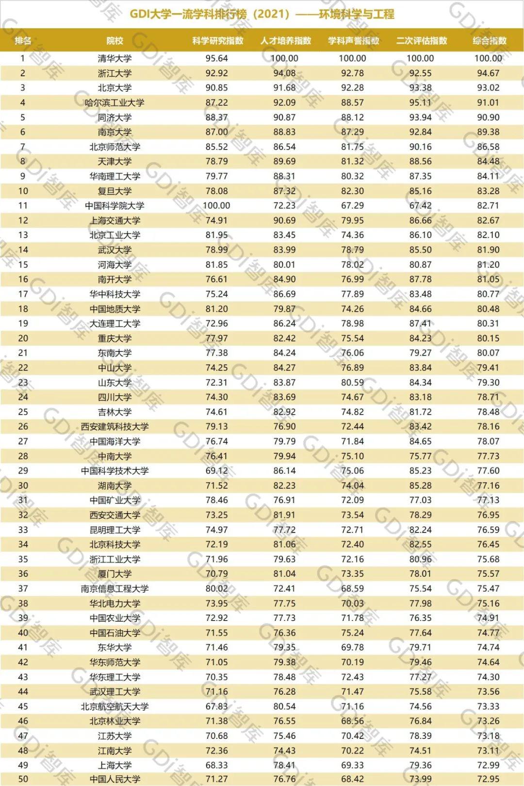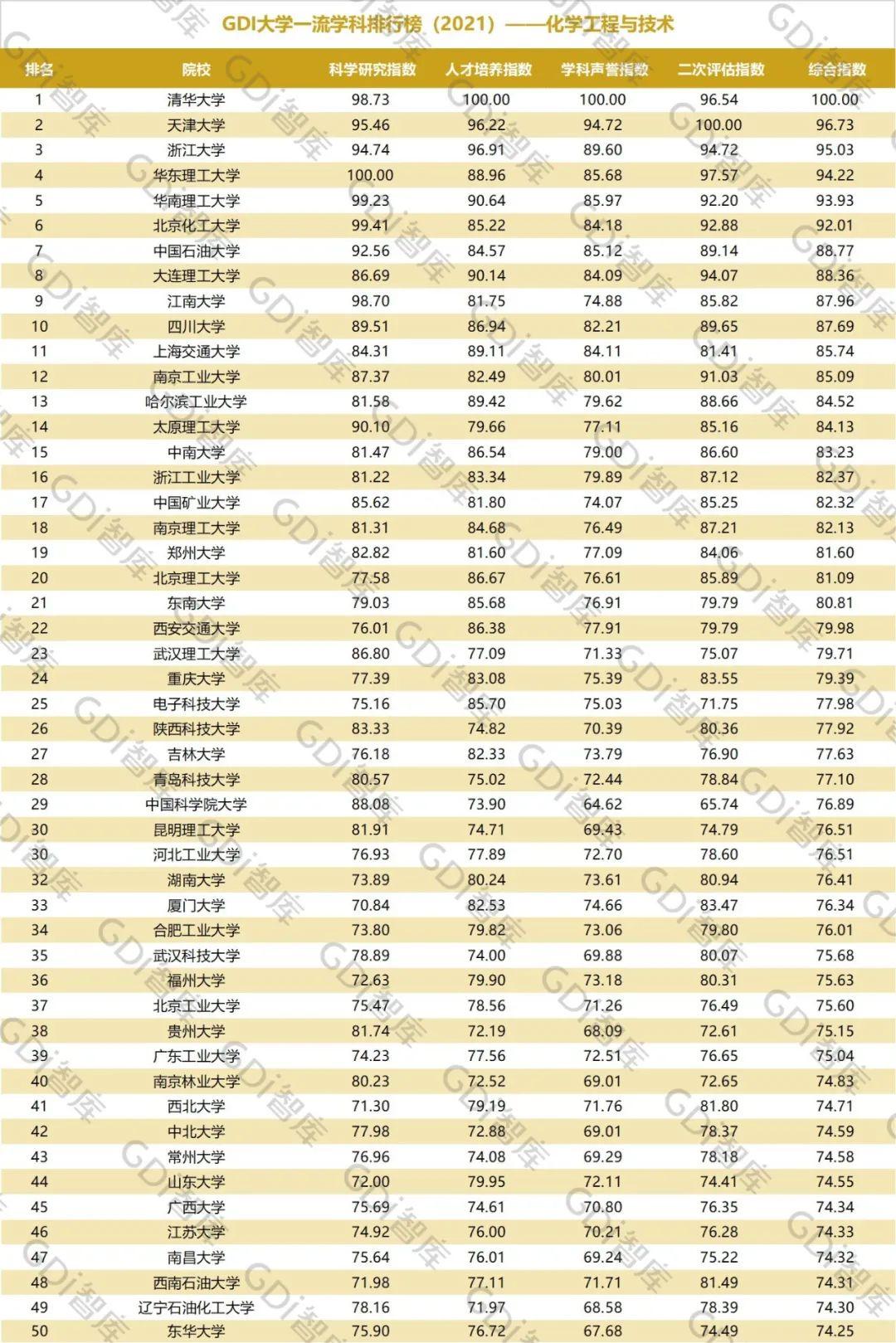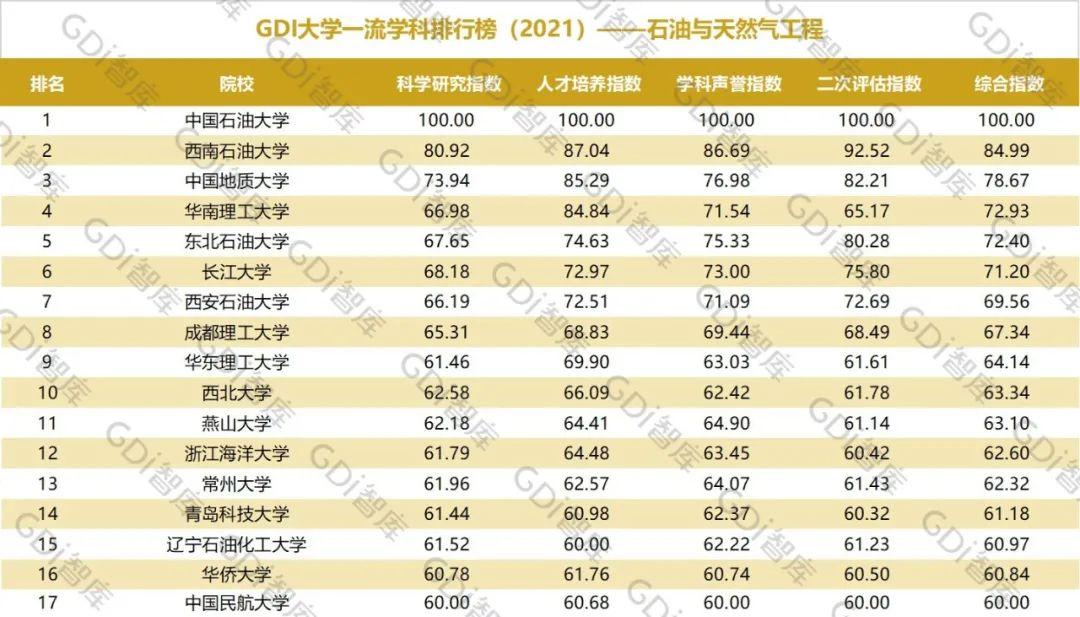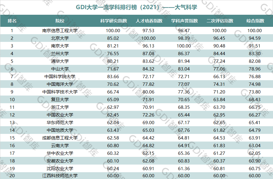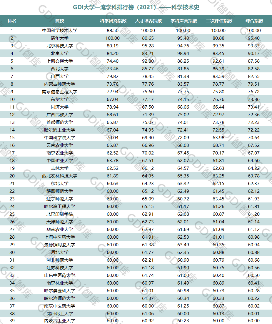 2021年6月15日,GDI智库发布“GDI大学一流学科排行榜(2021)”,通过科学研究指数、人才培养指数、学科声誉指数和二次评估指数四大一级指标科学评价518所院校的90个学科,艺术类学科不在本次评价范围。
