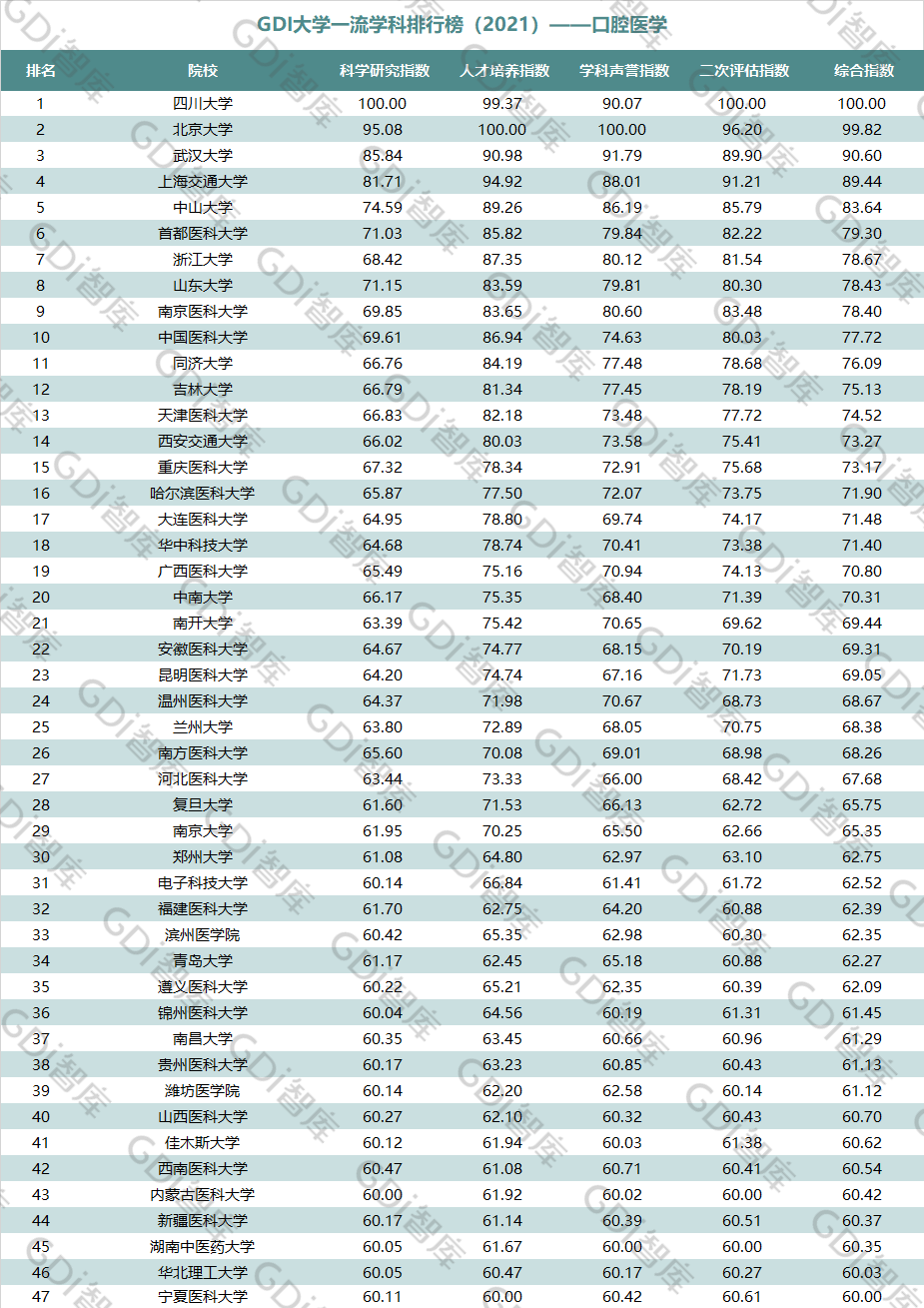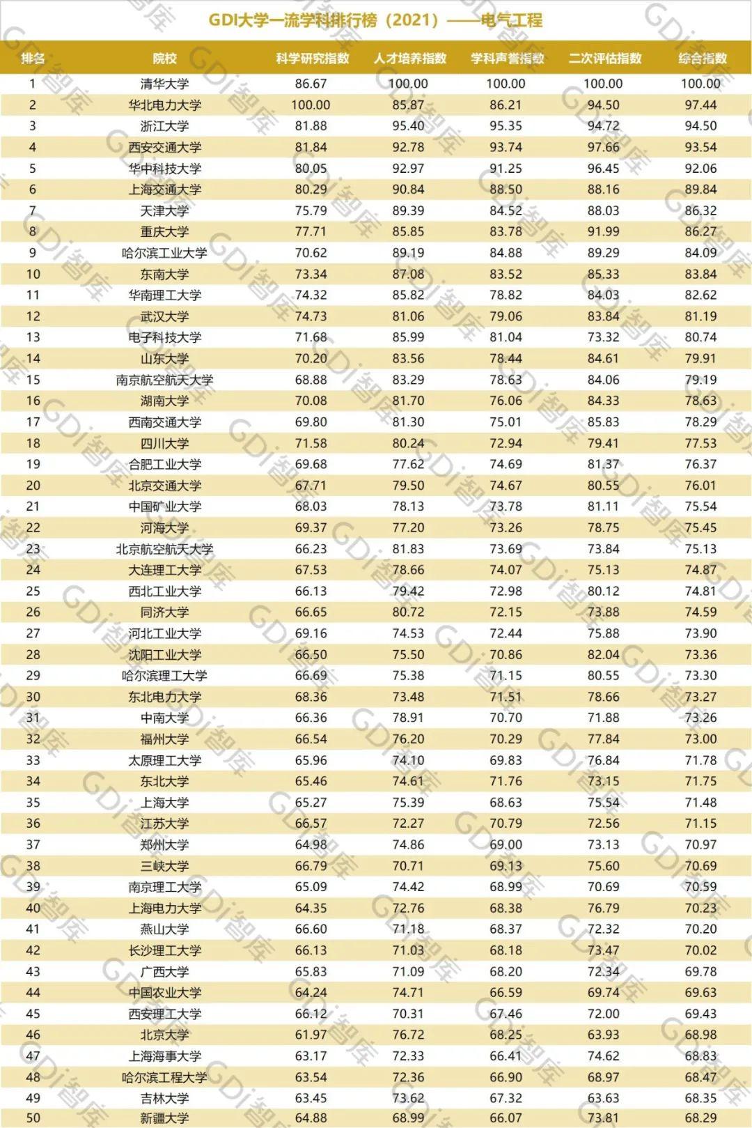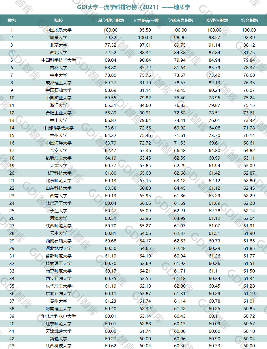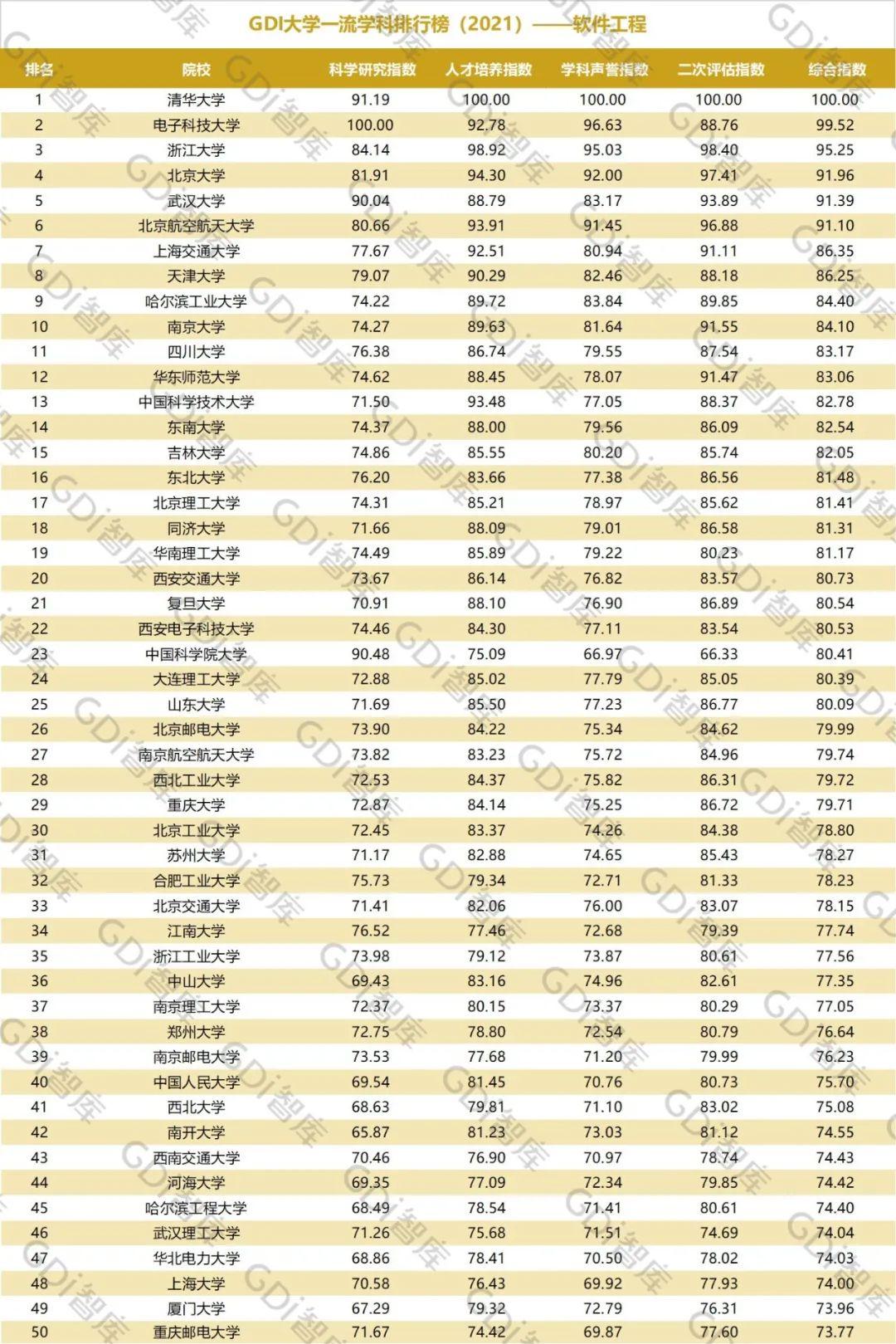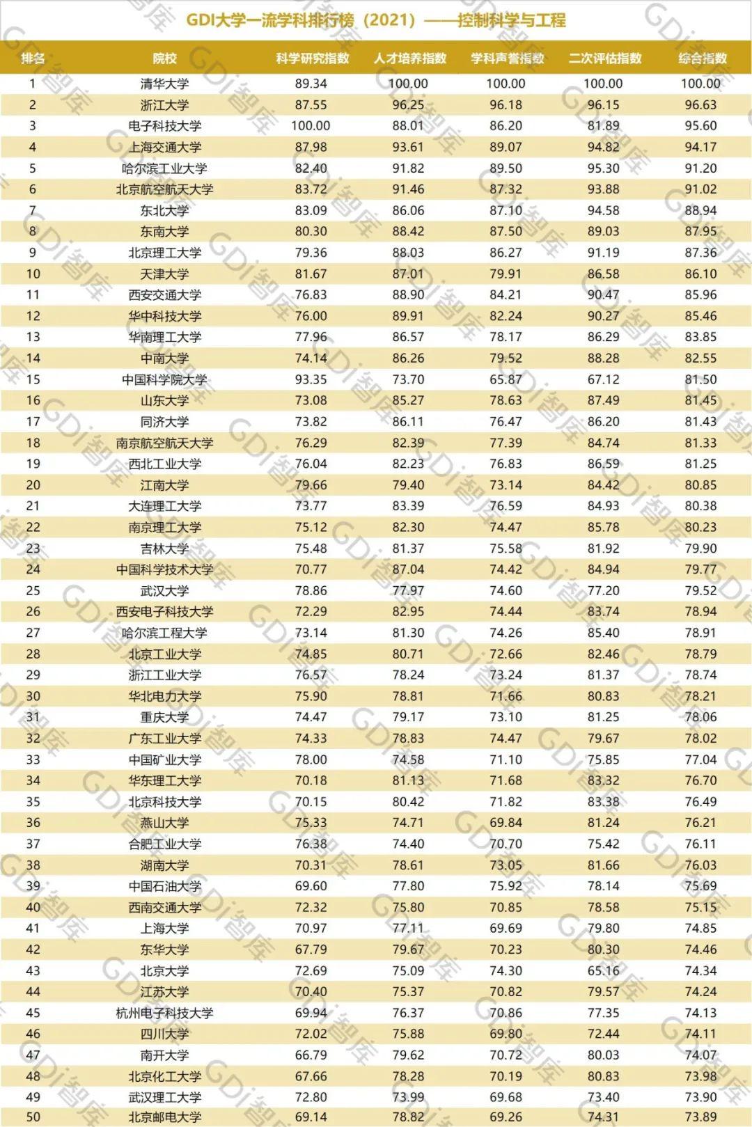 2021年6月15日,GDI智库发布“GDI大学一流学科排行榜(2021)”,通过科学研究指数、人才培养指数、学科声誉指数和二次评估指数四大一级指标科学评价518所院校的90个学科,艺术类学科不在本次评价范围。