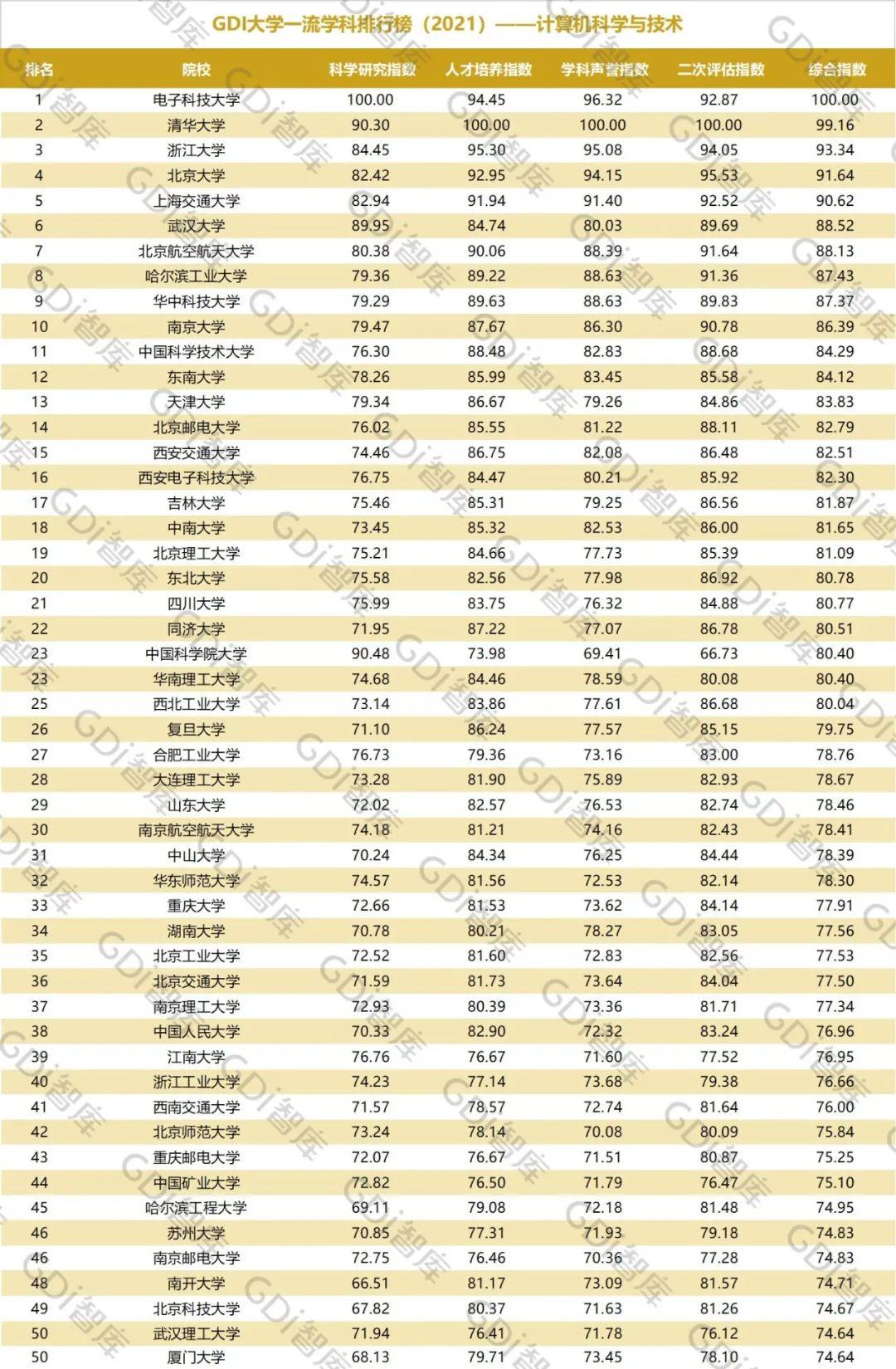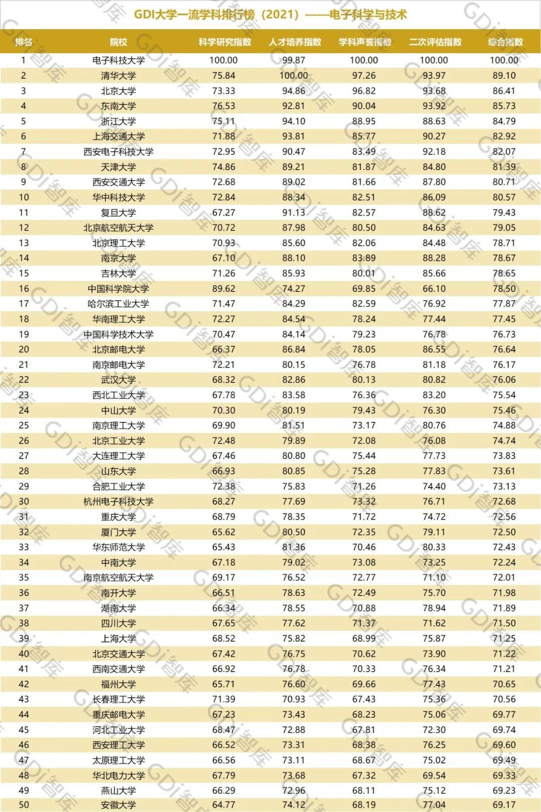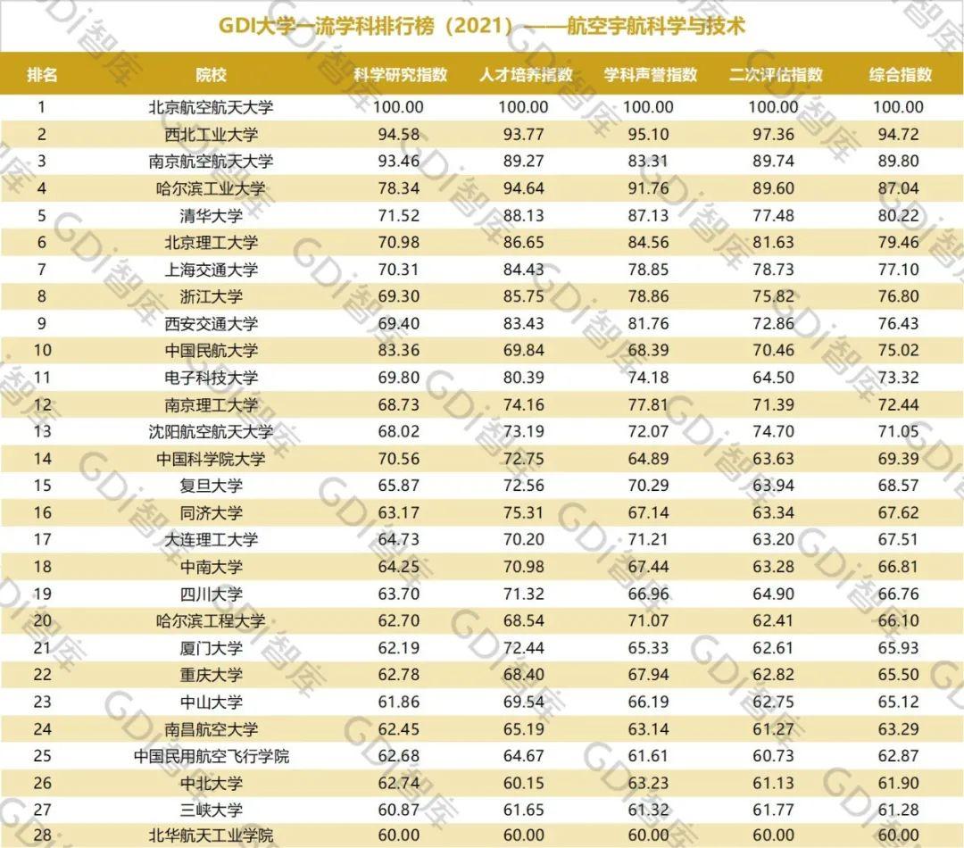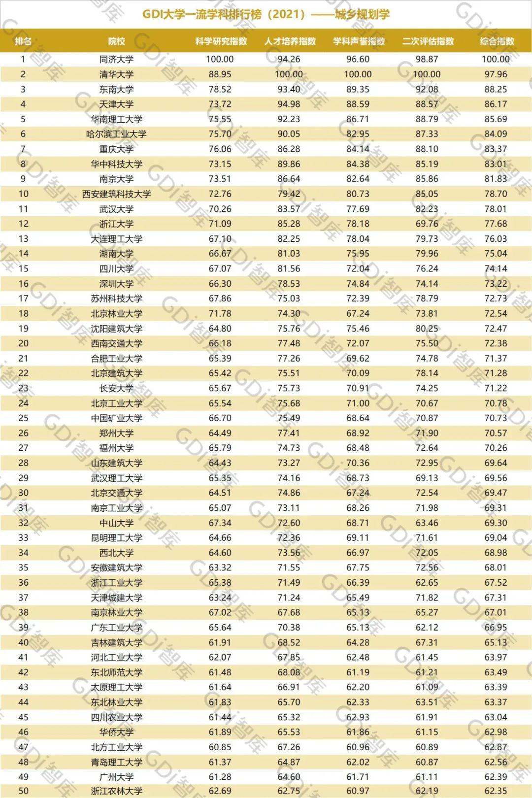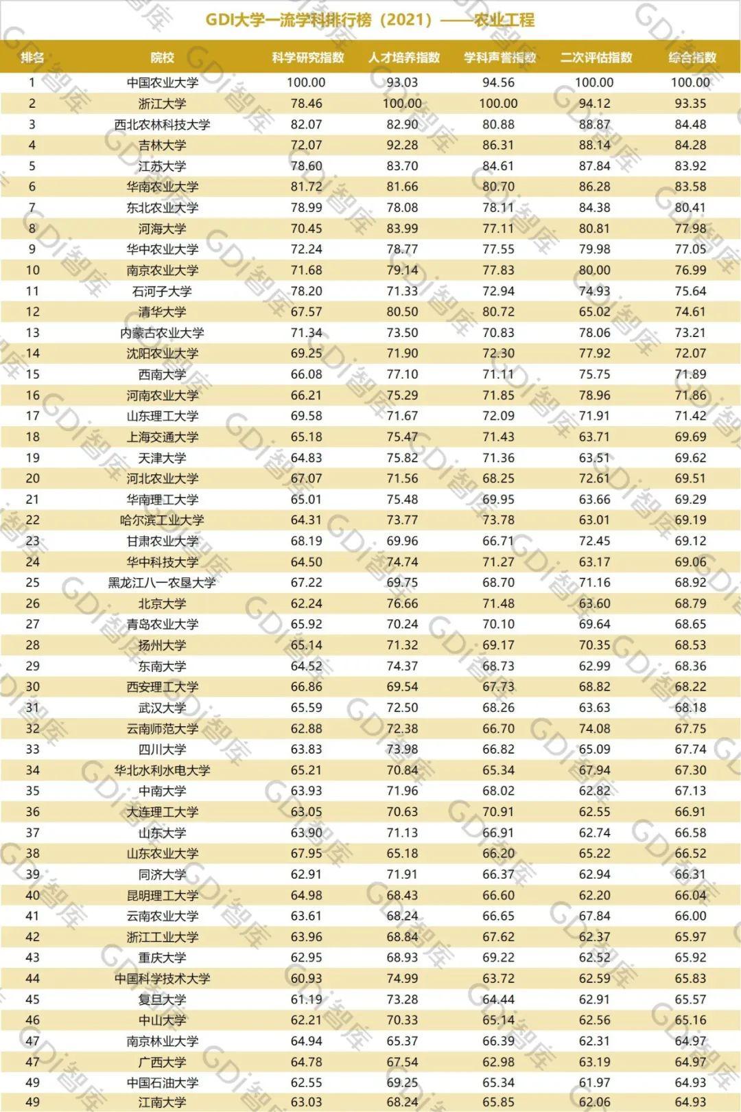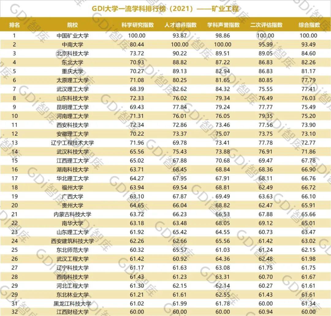 2021年6月15日,GDI智库发布“GDI大学一流学科排行榜(2021)”,通过科学研究指数、人才培养指数、学科声誉指数和二次评估指数四大一级指标科学评价518所院校的90个学科,艺术类学科不在本次评价范围。