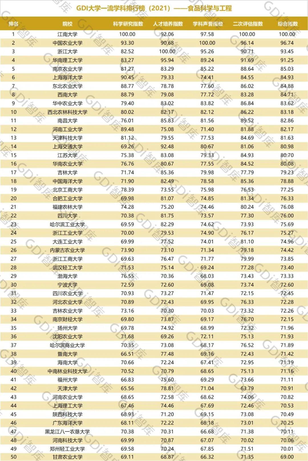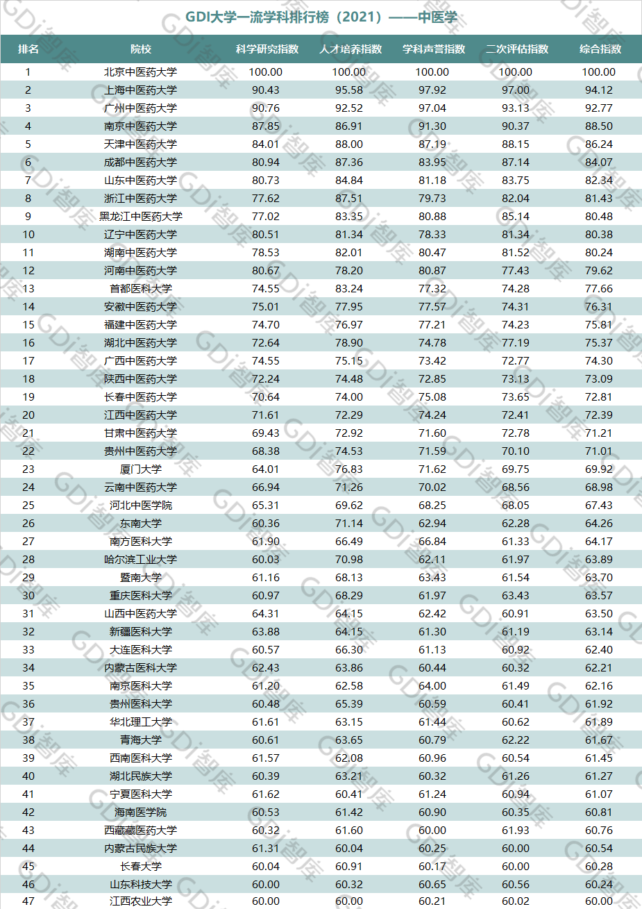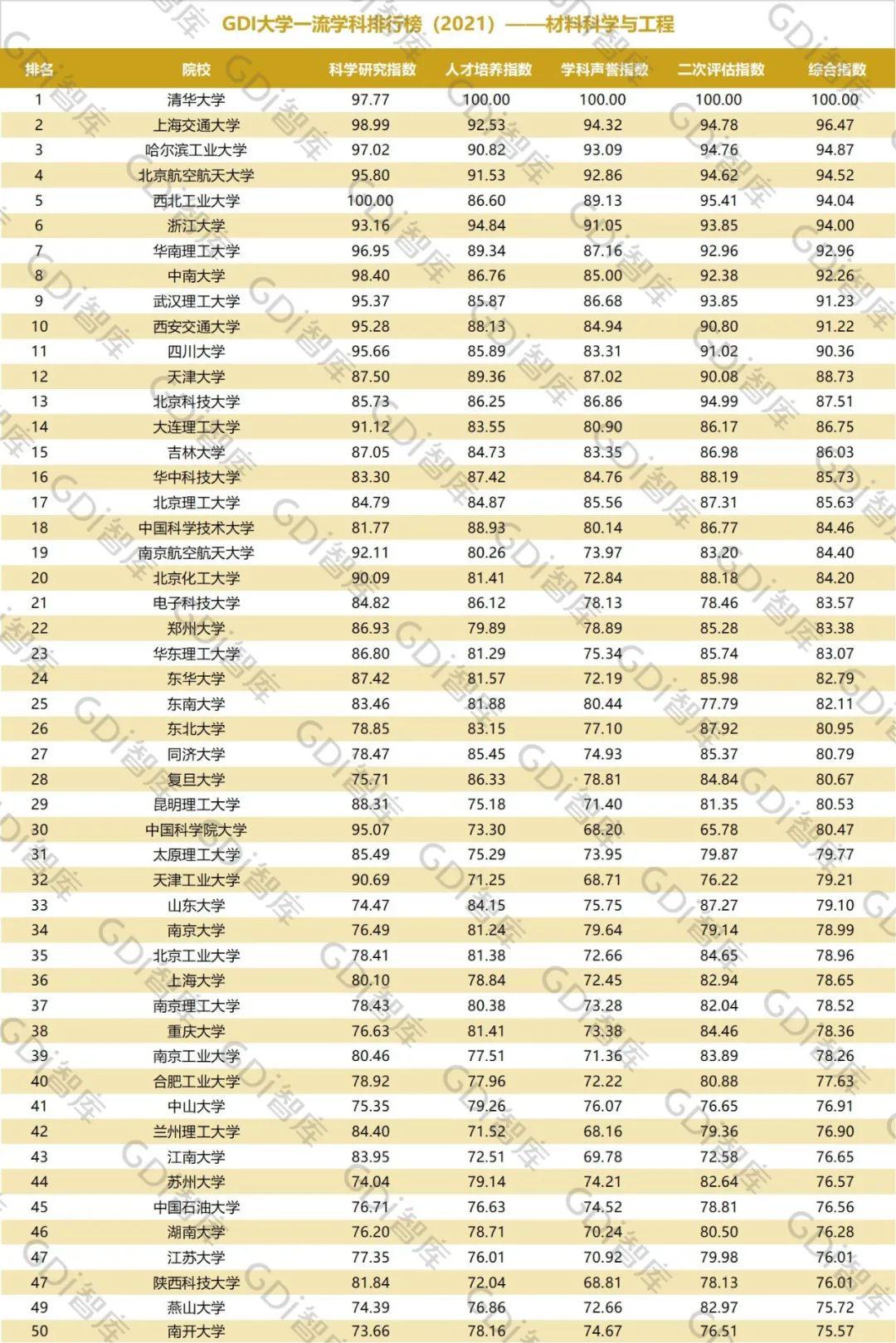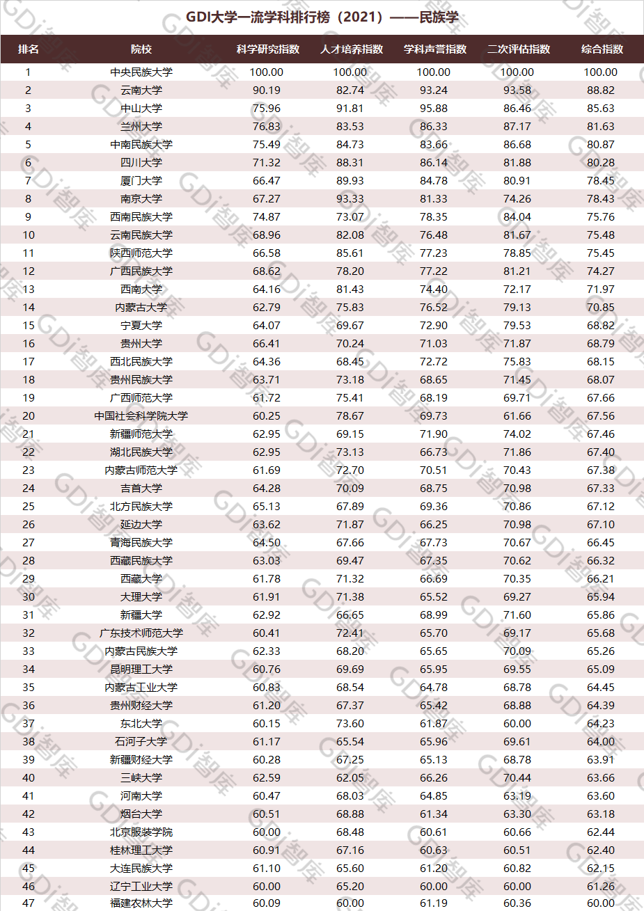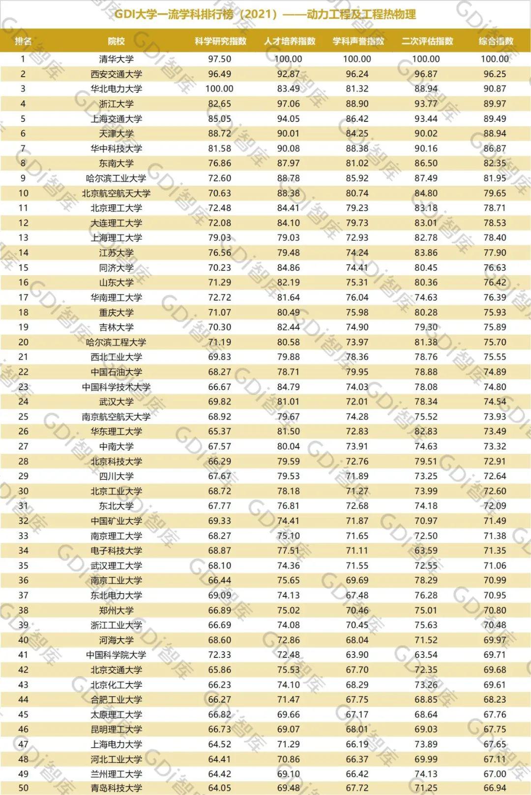 2021年6月15日,GDI智库发布“GDI大学一流学科排行榜(2021)”,通过科学研究指数、人才培养指数、学科声誉指数和二次评估指数四大一级指标科学评价518所院校的90个学科,艺术类学科不在本次评价范围。