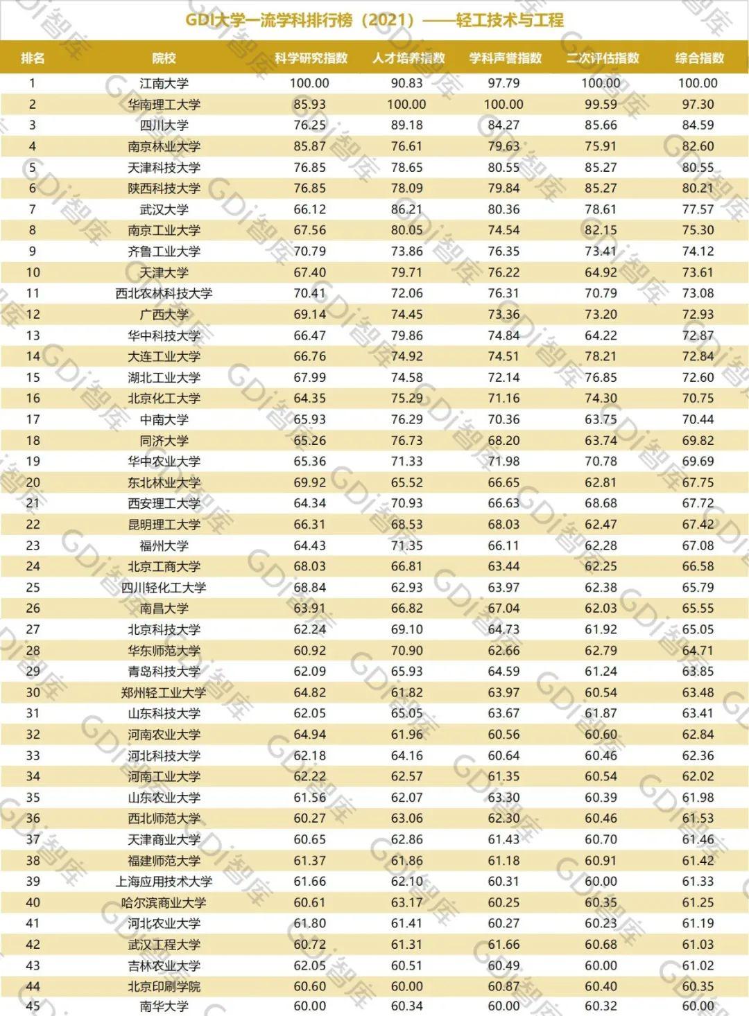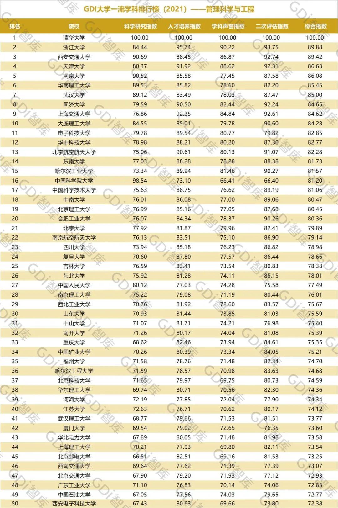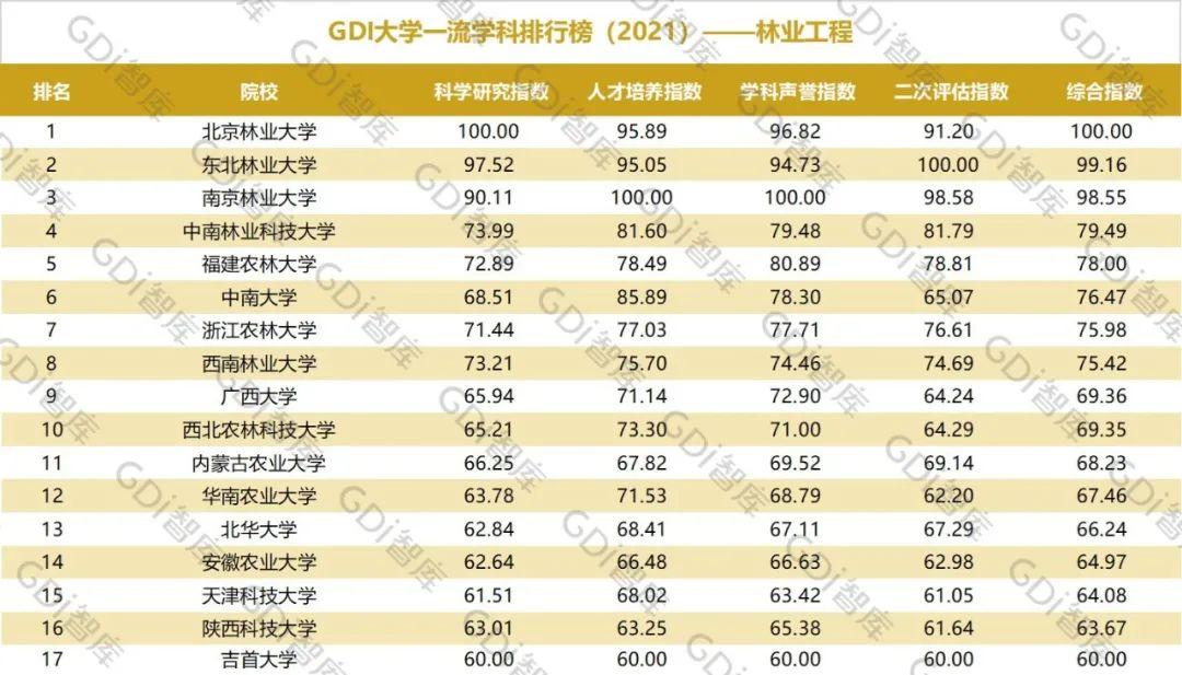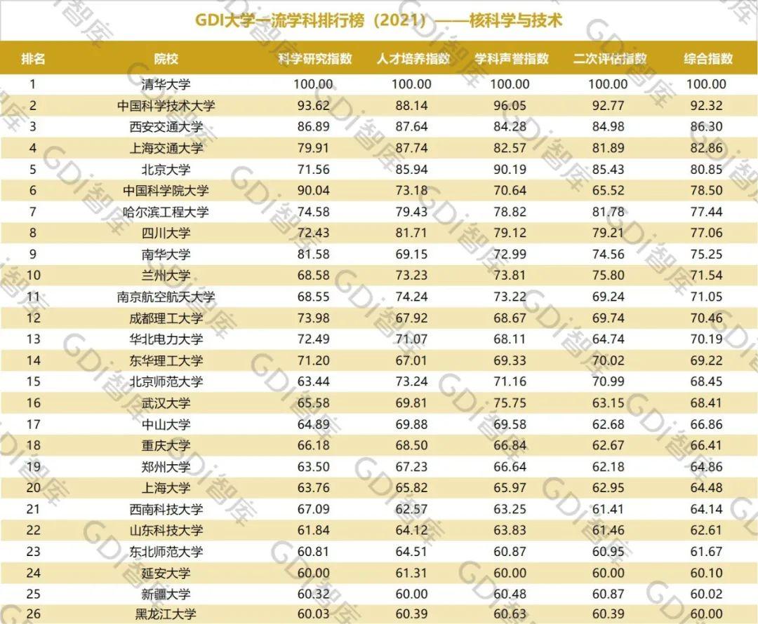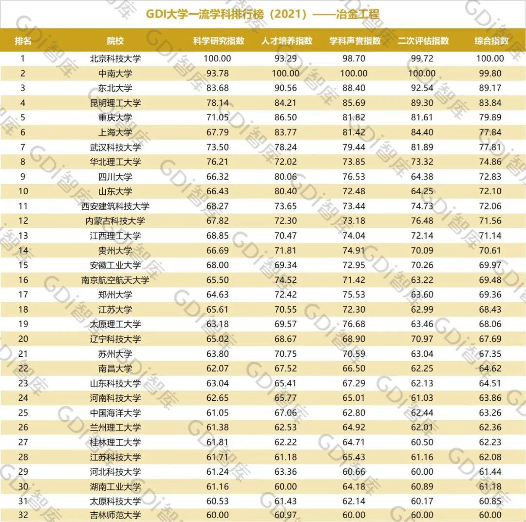 2021年6月15日,GDI智库发布“GDI大学一流学科排行榜(2021)”,通过科学研究指数、人才培养指数、学科声誉指数和二次评估指数四大一级指标科学评价518所院校的90个学科,艺术类学科不在本次评价范围。