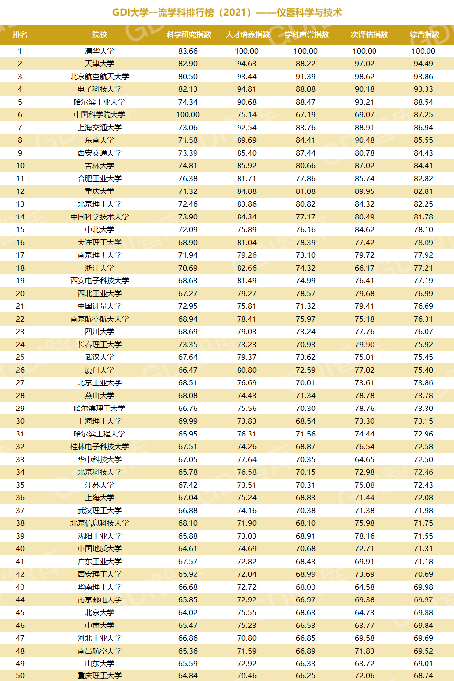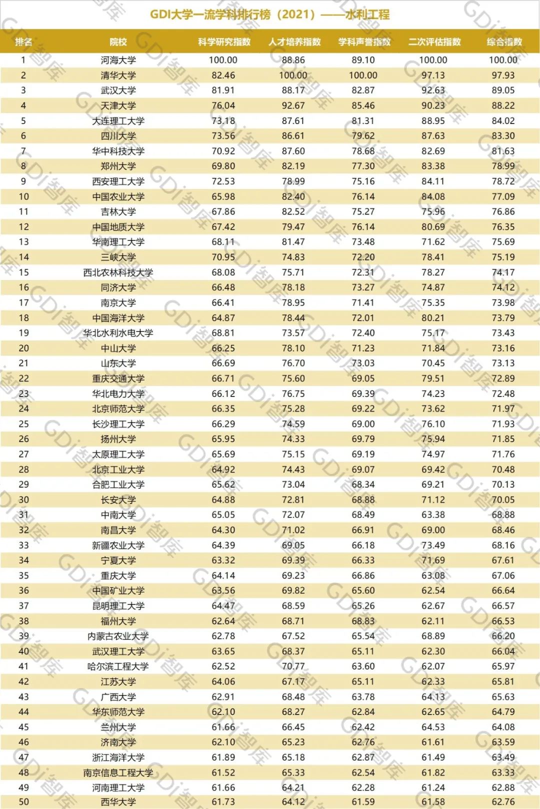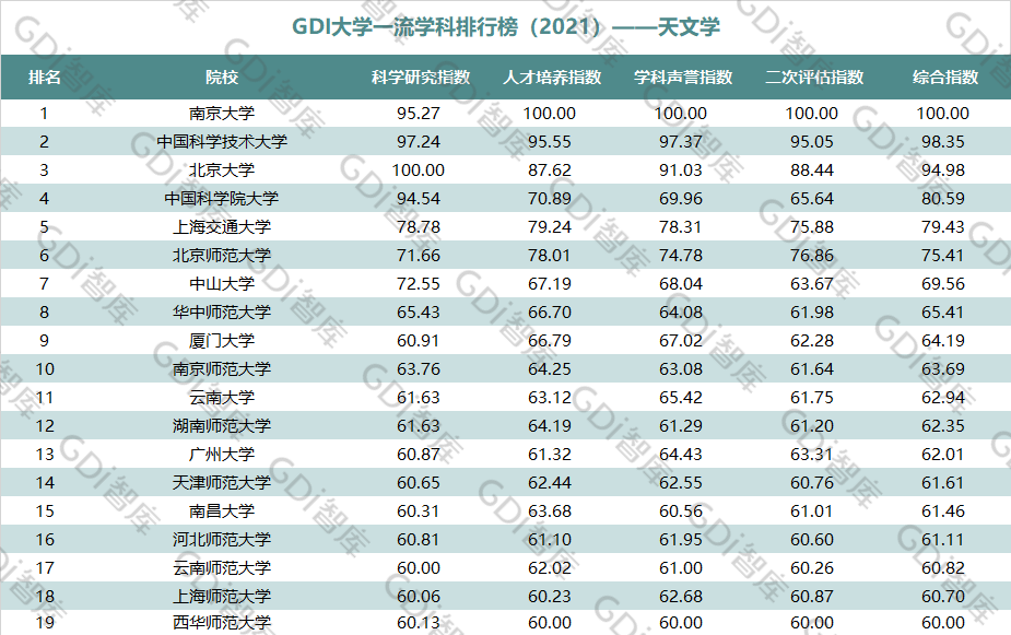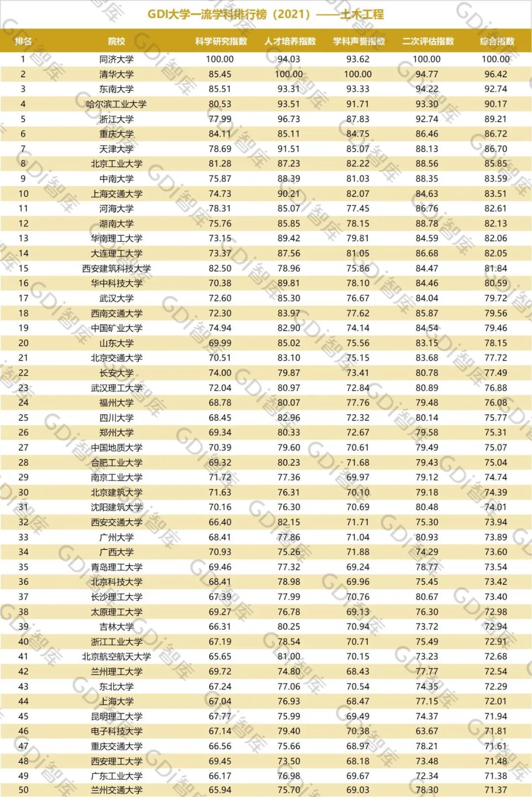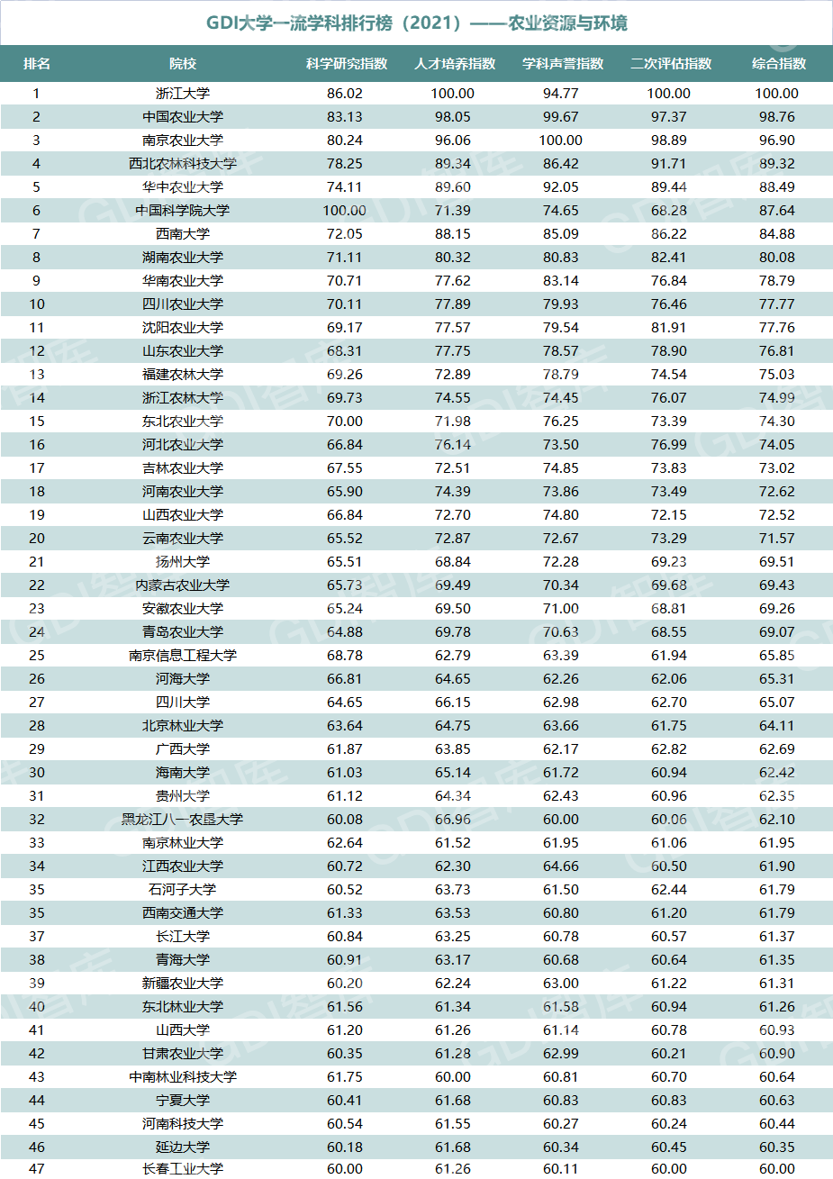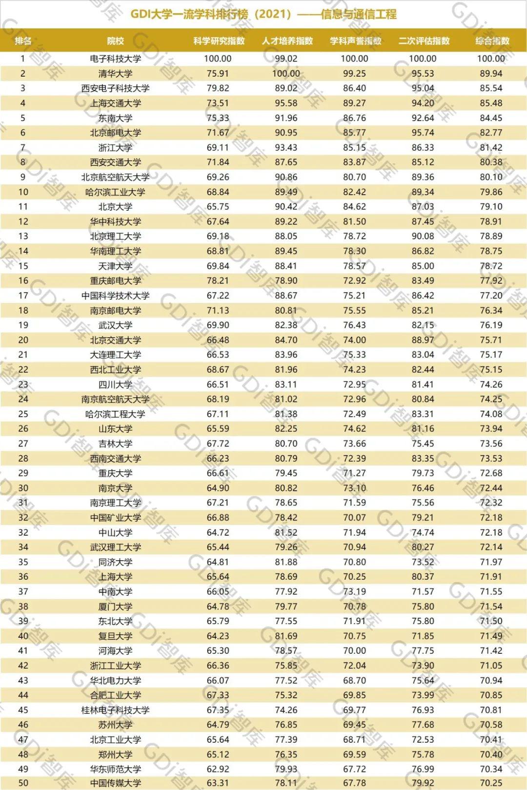 2021年6月15日,GDI智库发布“GDI大学一流学科排行榜(2021)”,通过科学研究指数、人才培养指数、学科声誉指数和二次评估指数四大一级指标科学评价518所院校的90个学科,艺术类学科不在本次评价范围。
