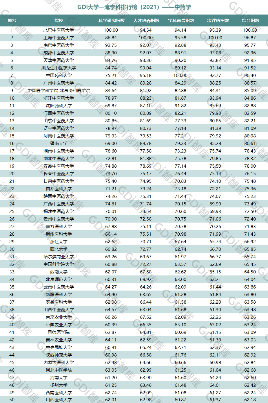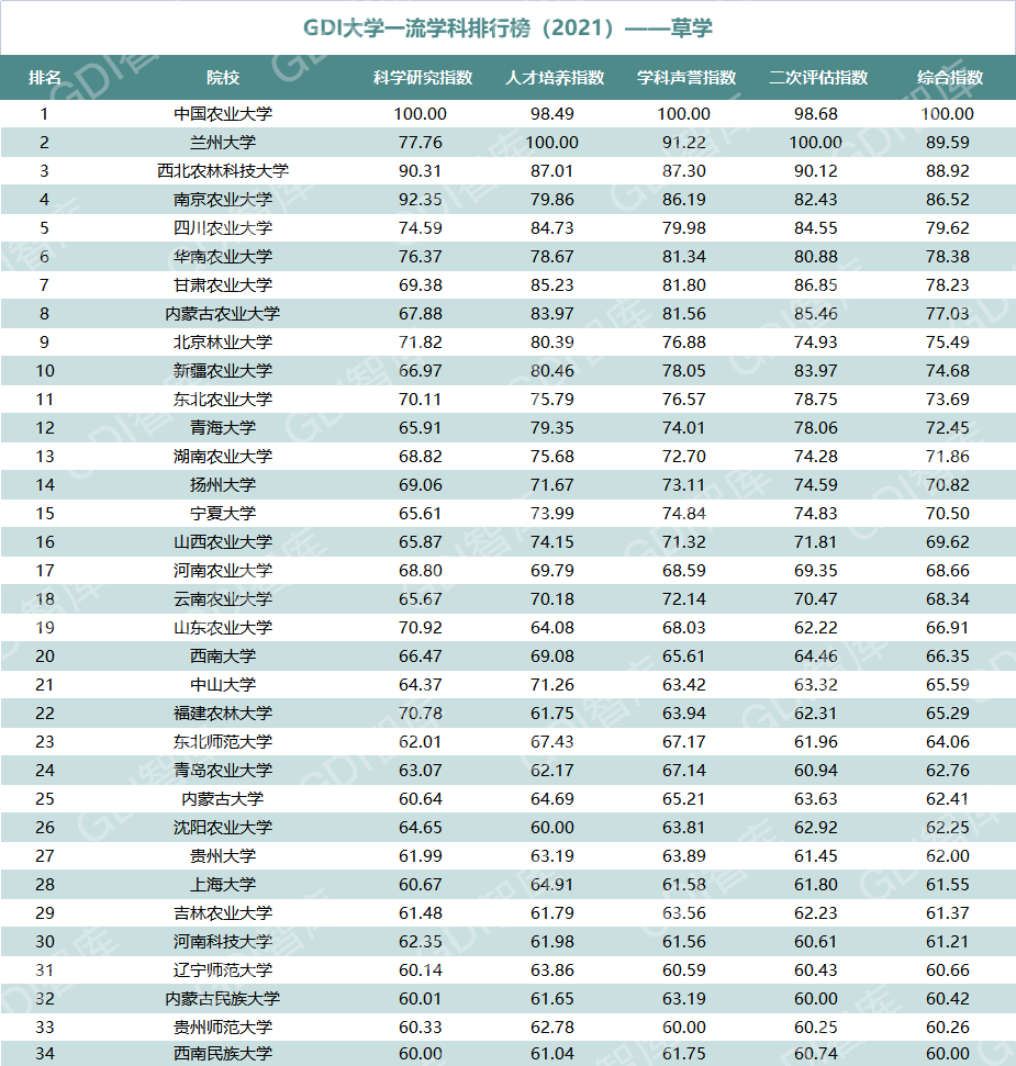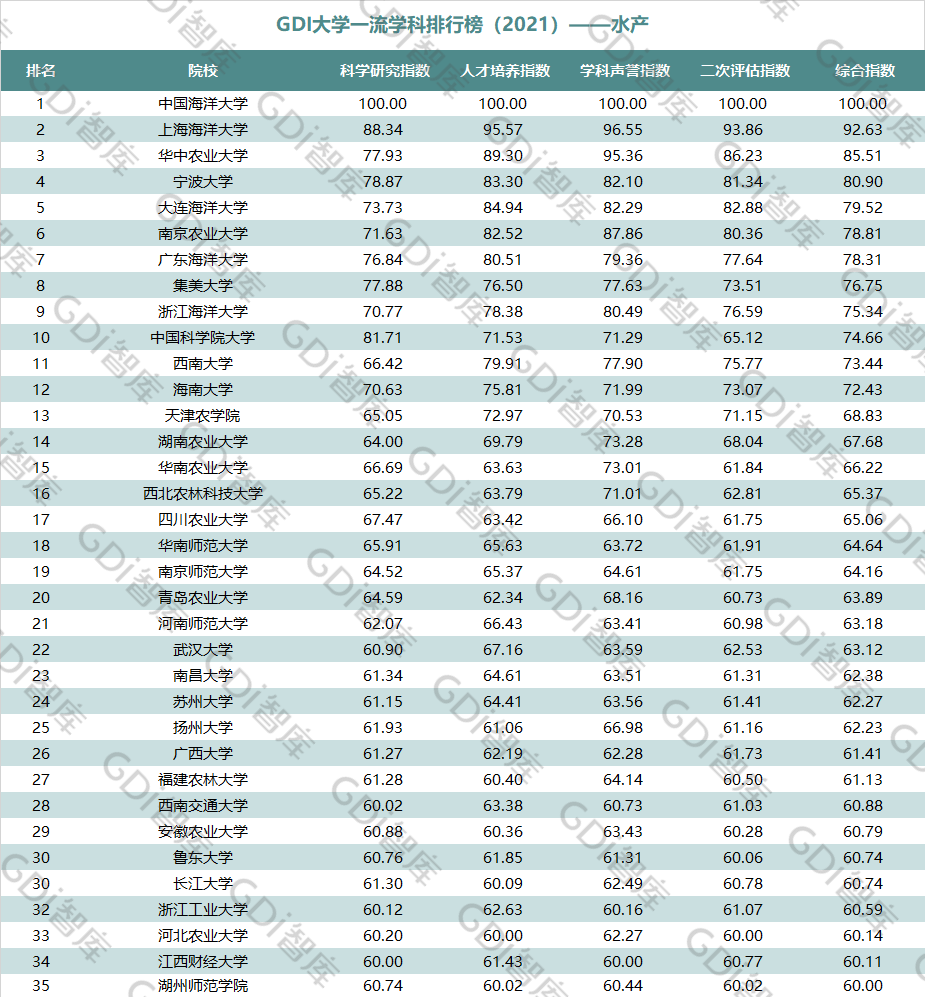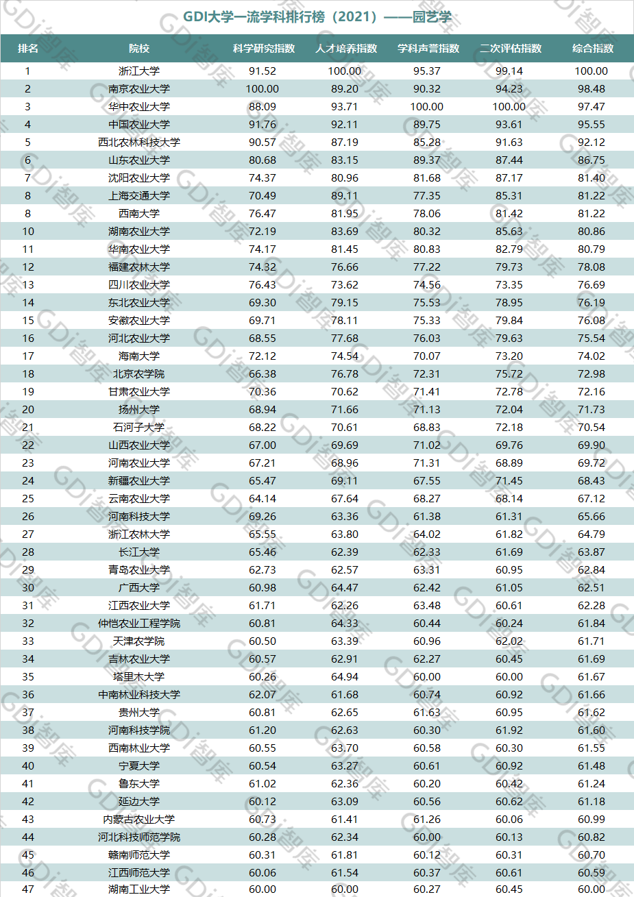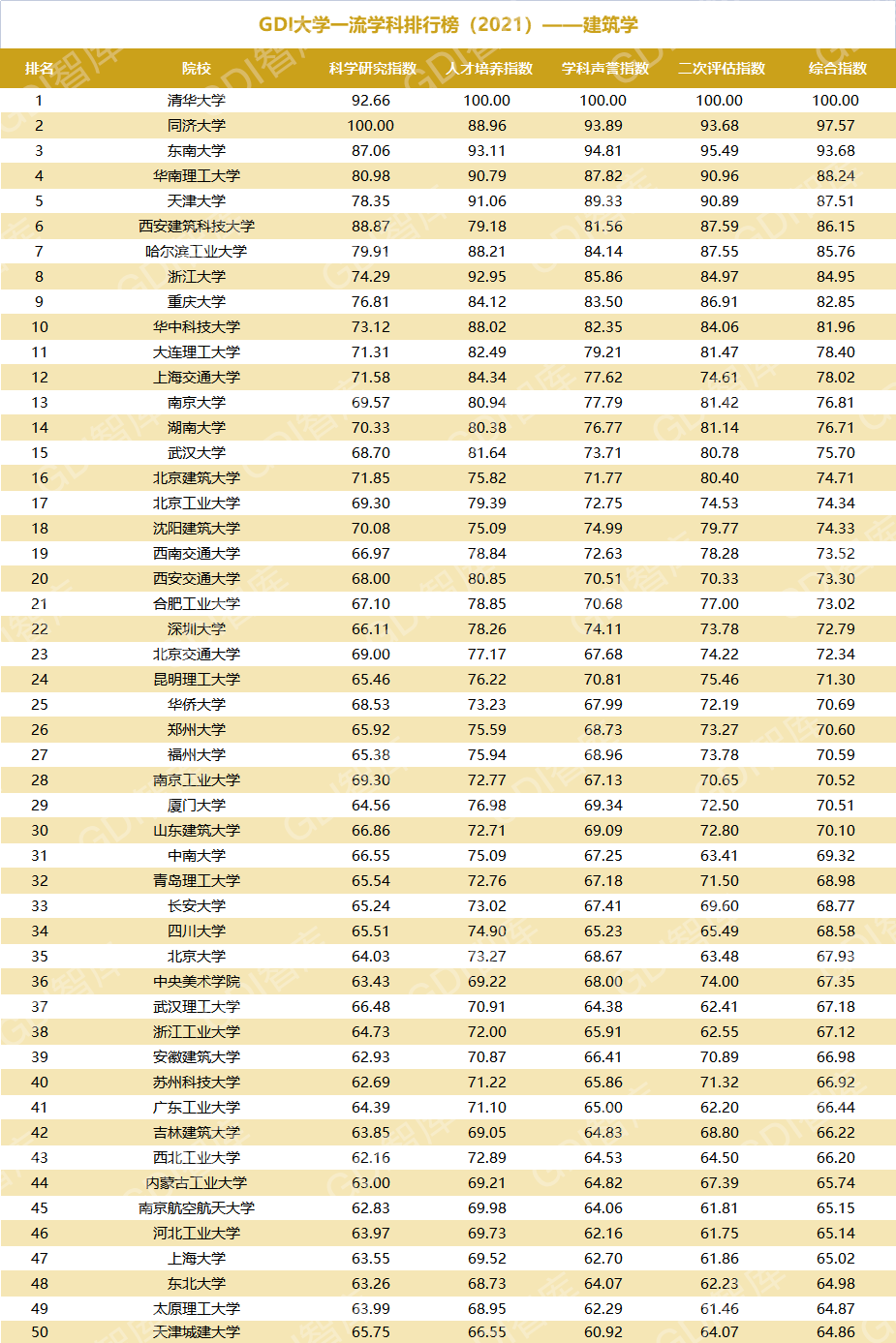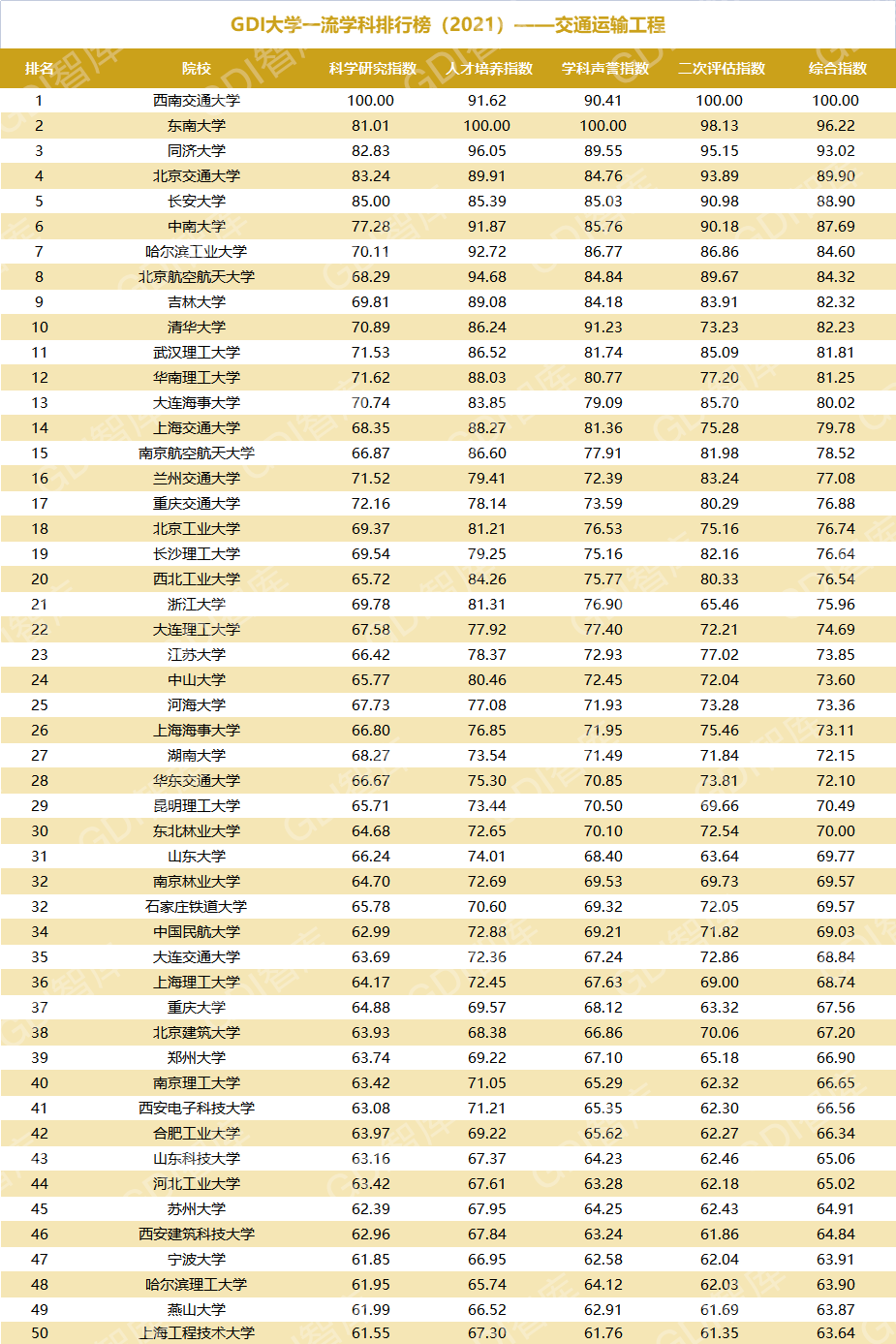 2021年6月15日,GDI智库发布“GDI大学一流学科排行榜(2021)”,通过科学研究指数、人才培养指数、学科声誉指数和二次评估指数四大一级指标科学评价518所院校的90个学科,艺术类学科不在本次评价范围。