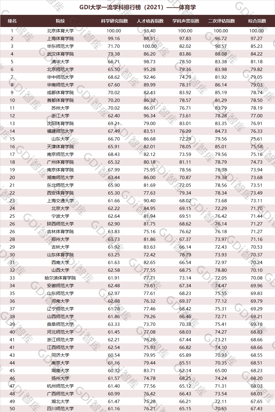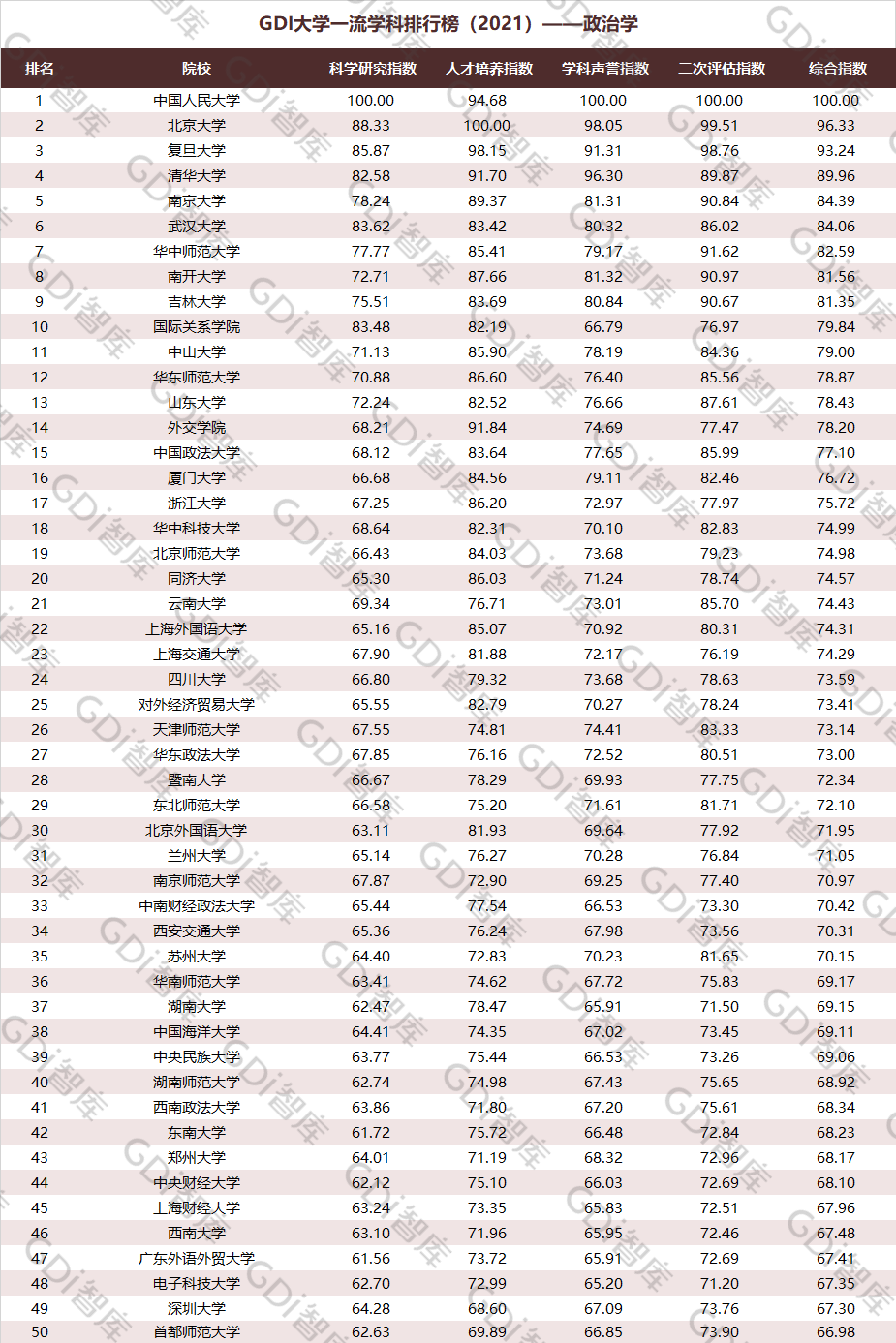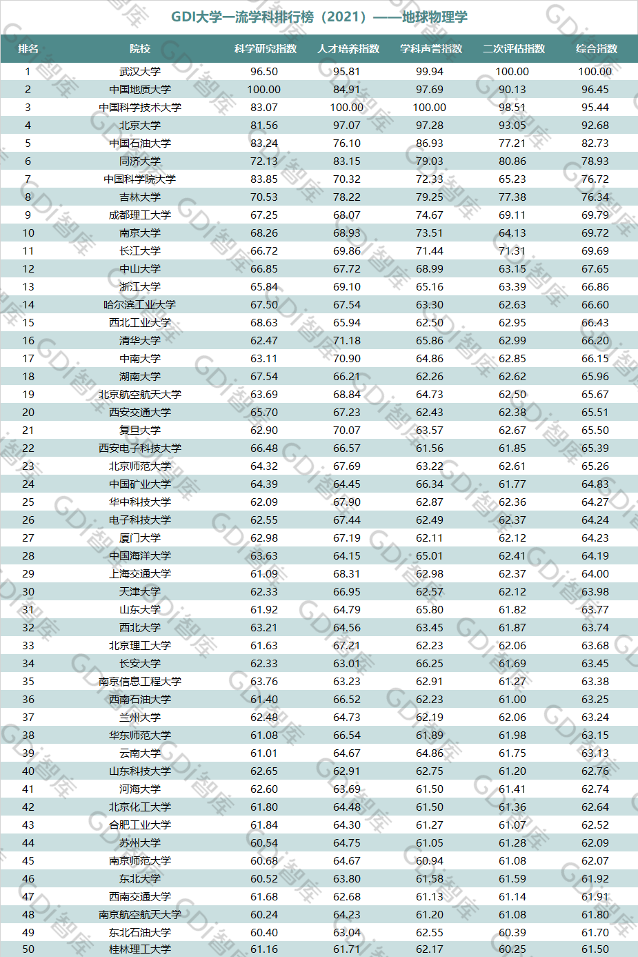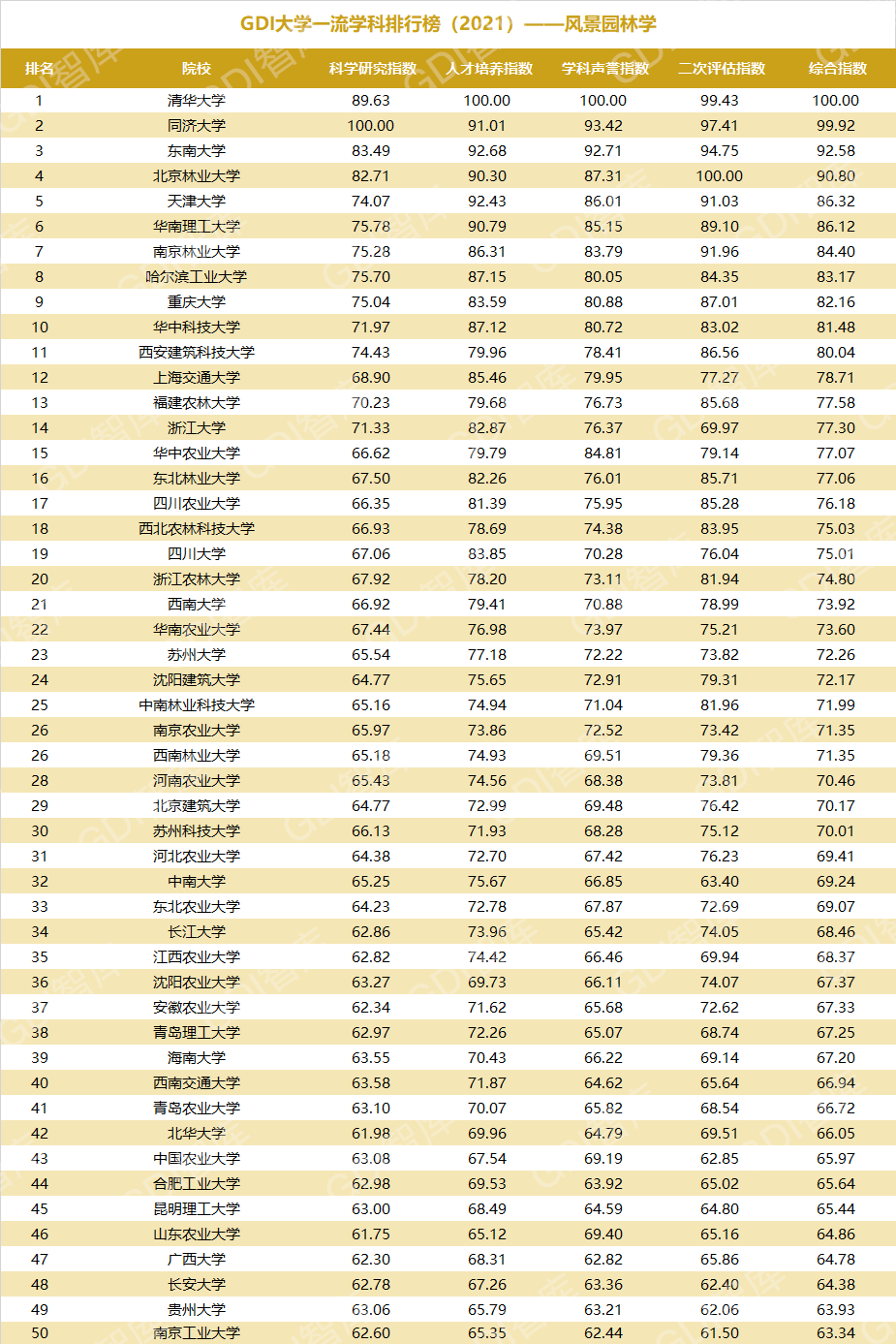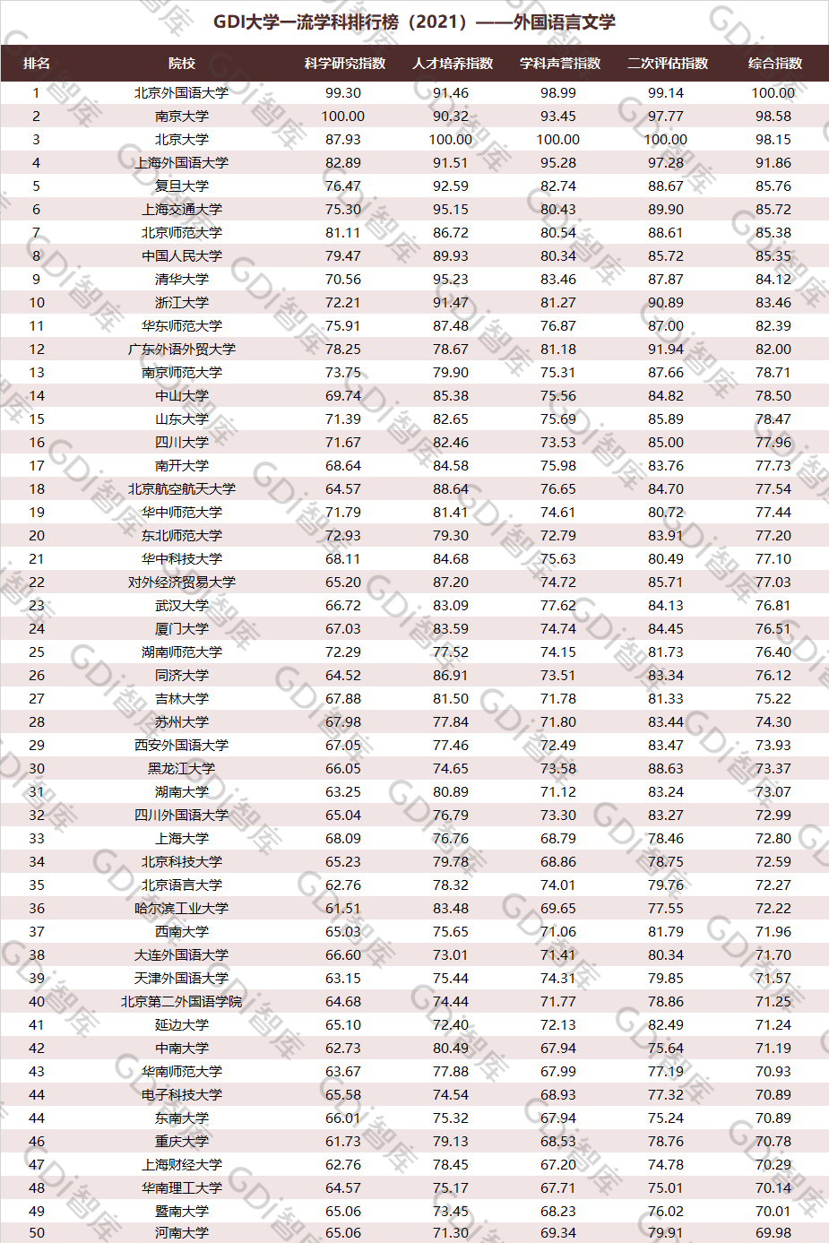 2021年6月15日,GDI智库发布“GDI大学一流学科排行榜(2021)”,通过科学研究指数、人才培养指数、学科声誉指数和二次评估指数四大一级指标科学评价518所院校的90个学科,艺术类学科不在本次评价范围。