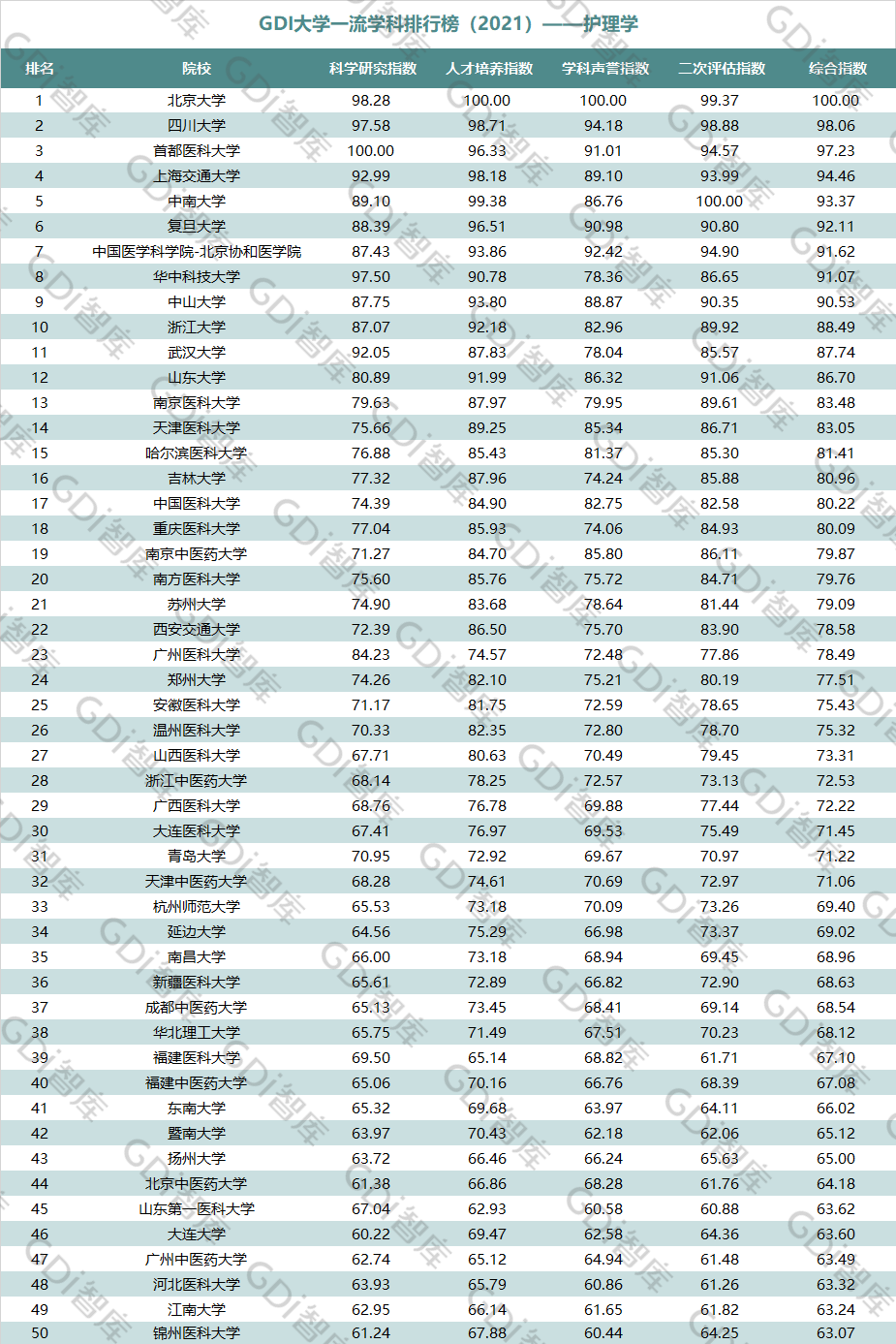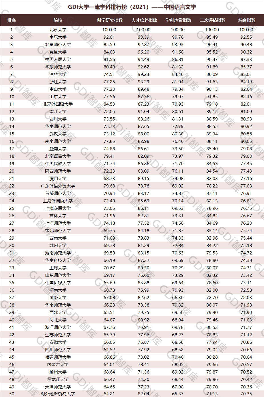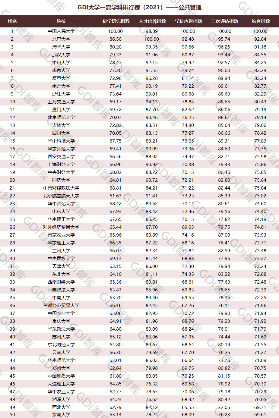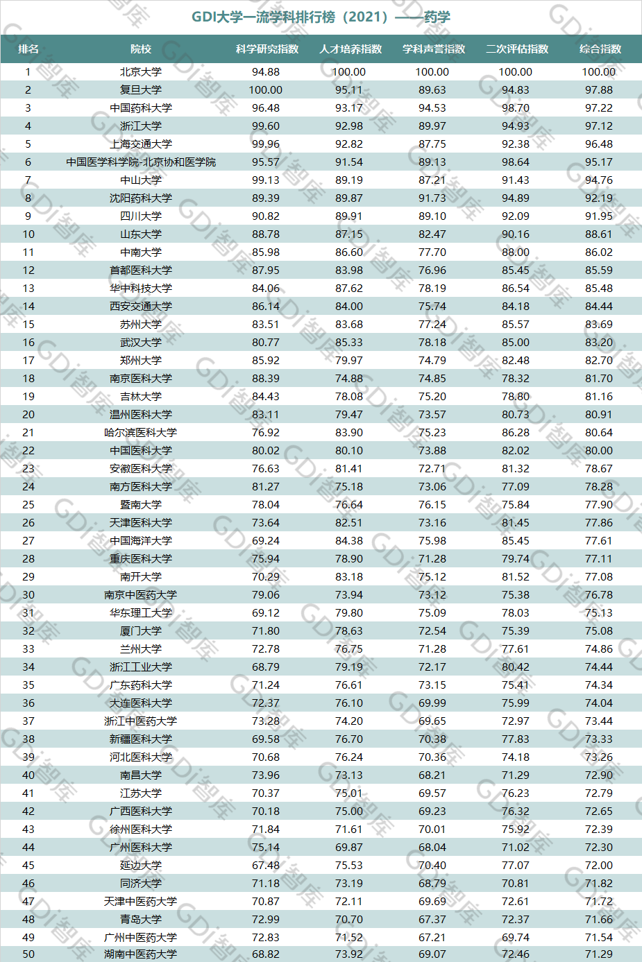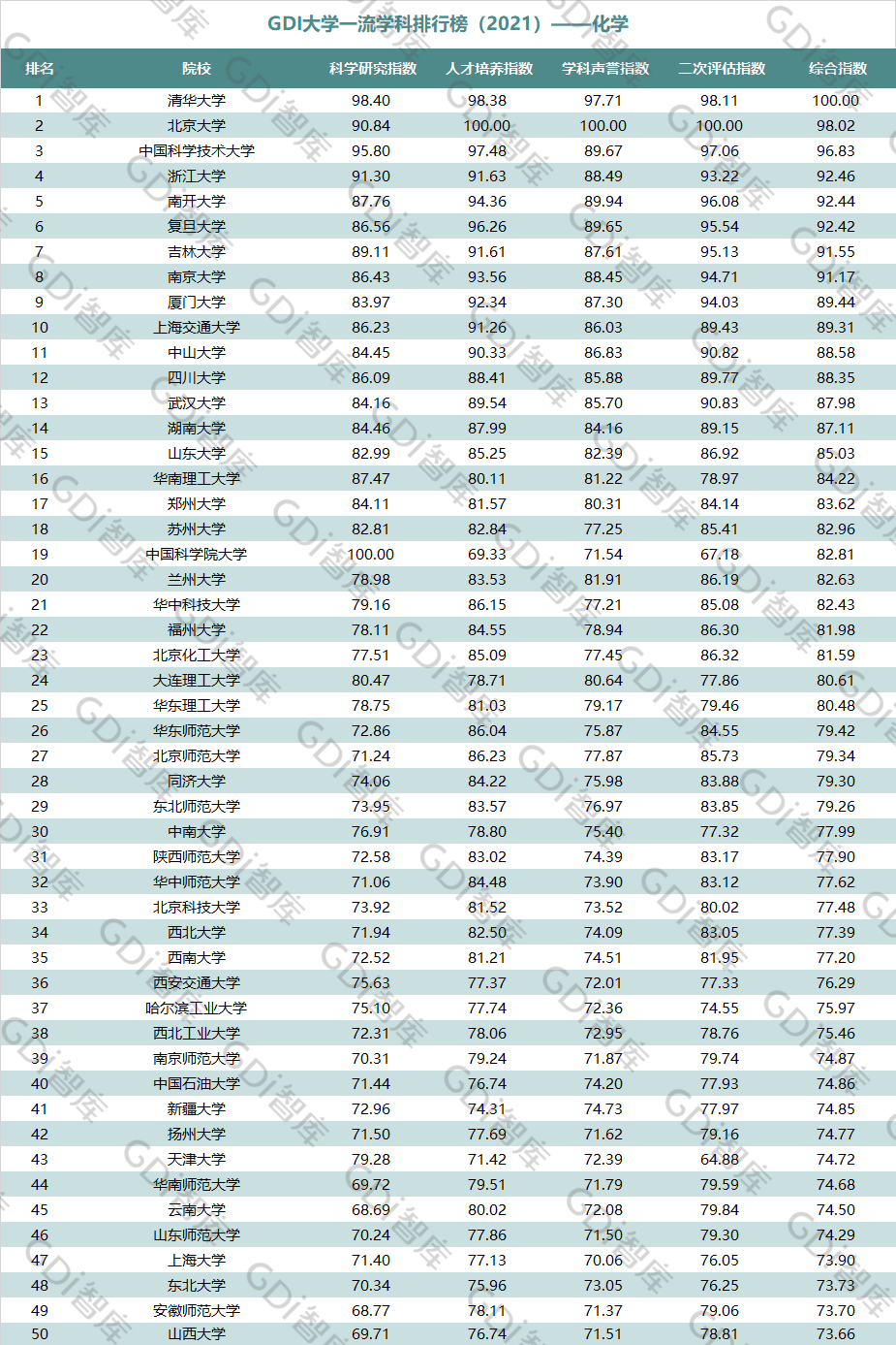 2021年6月15日,GDI智库发布“GDI大学一流学科排行榜(2021)”,通过科学研究指数、人才培养指数、学科声誉指数和二次评估指数四大一级指标科学评价518所院校的90个学科,艺术类学科不在本次评价范围。
