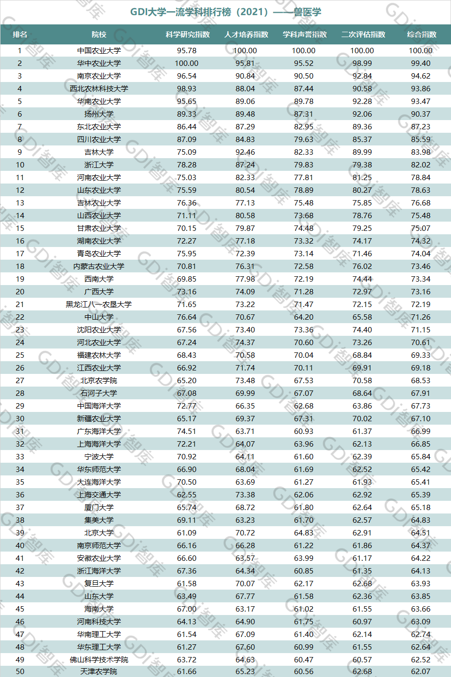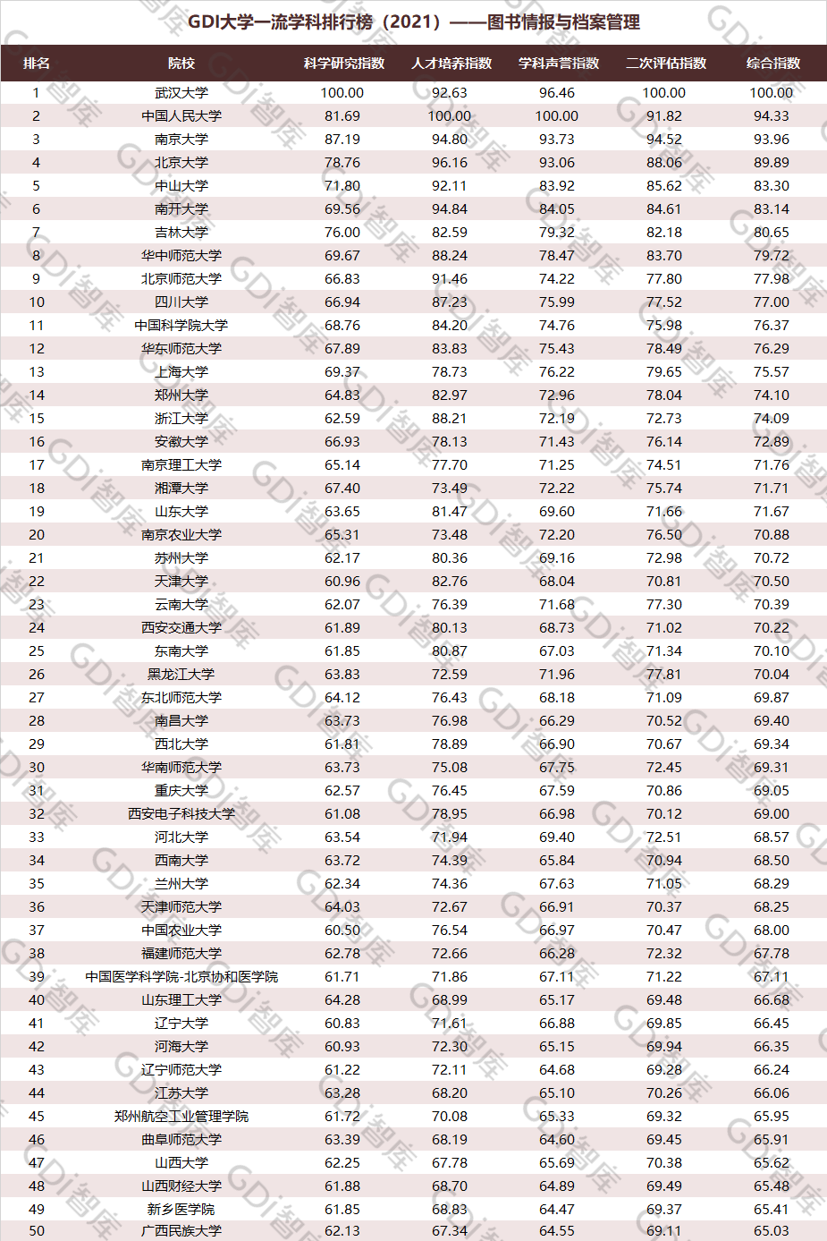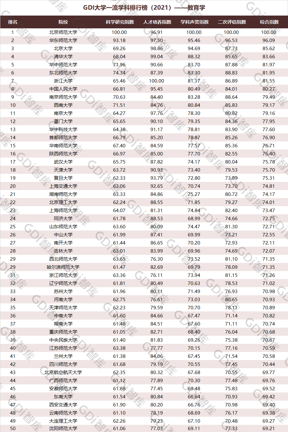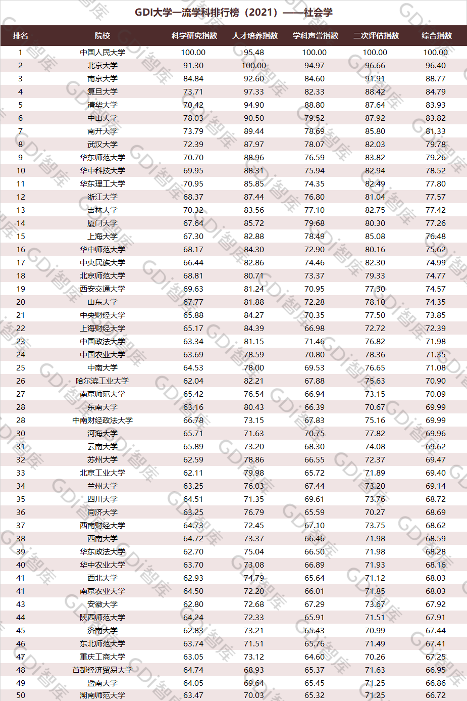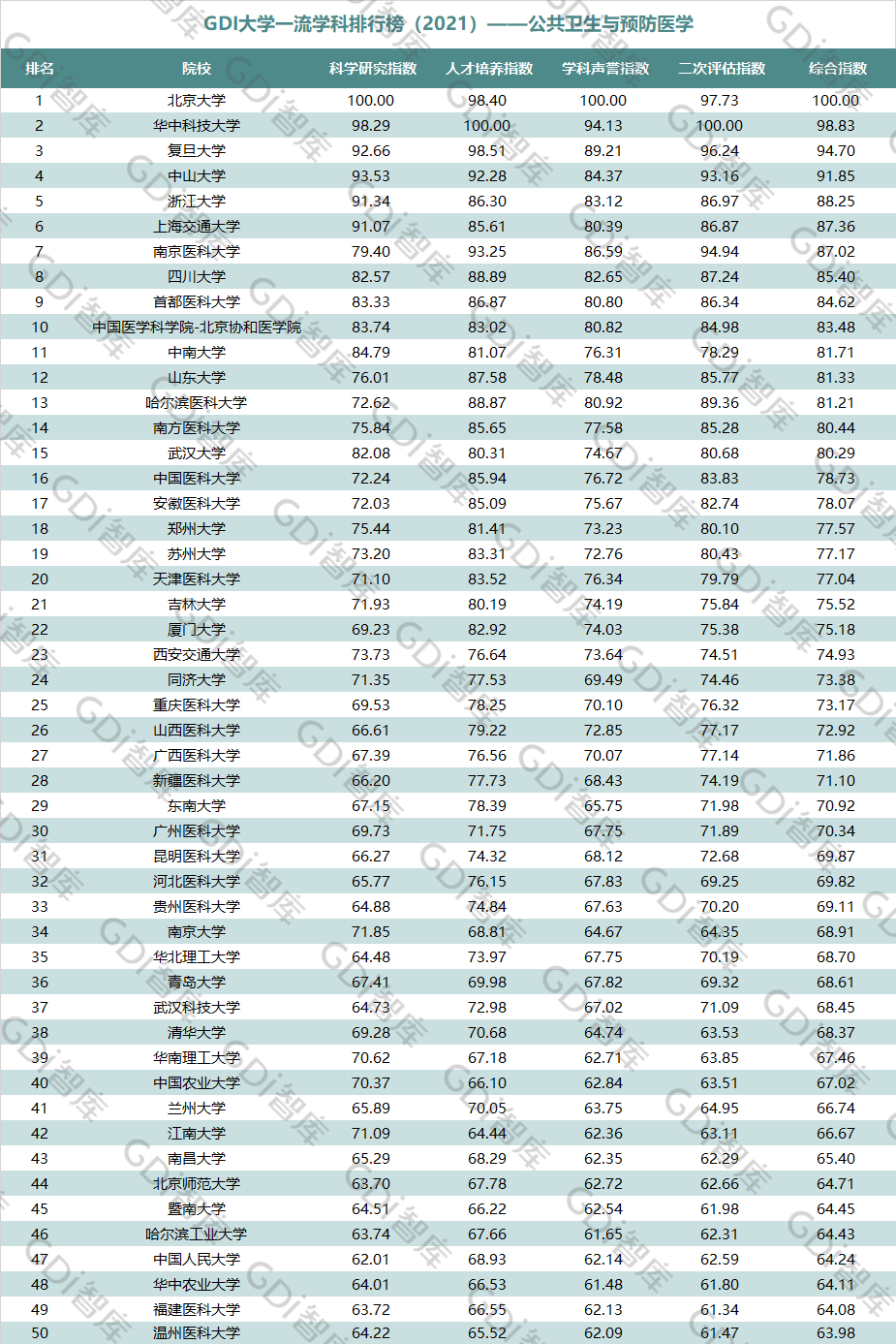 2021年6月15日,GDI智库发布“GDI大学一流学科排行榜(2021)”,通过科学研究指数、人才培养指数、学科声誉指数和二次评估指数四大一级指标科学评价518所院校的90个学科,艺术类学科不在本次评价范围。