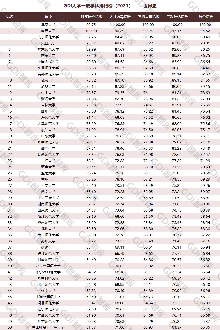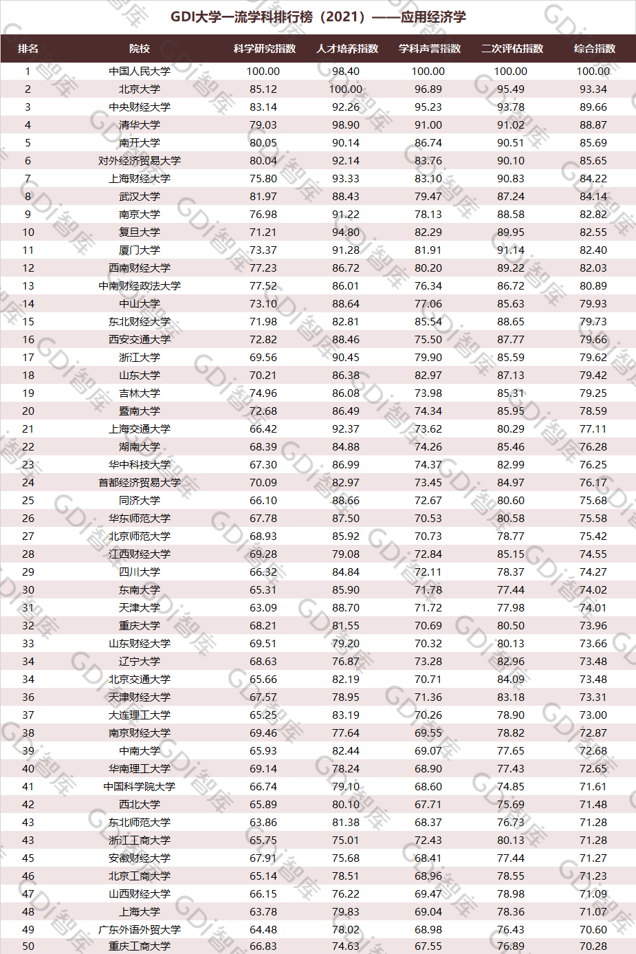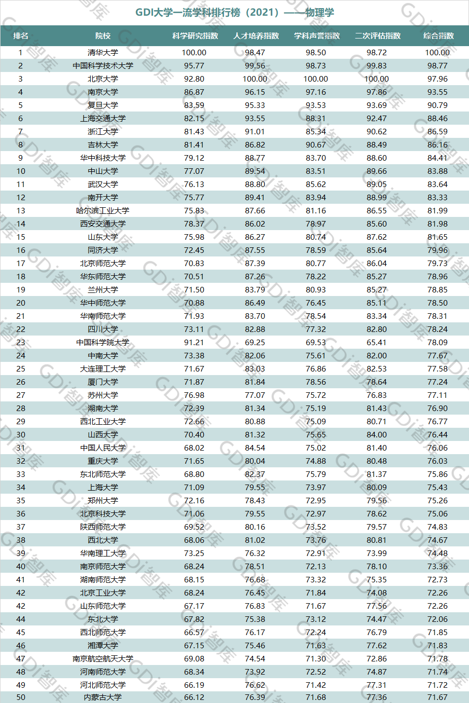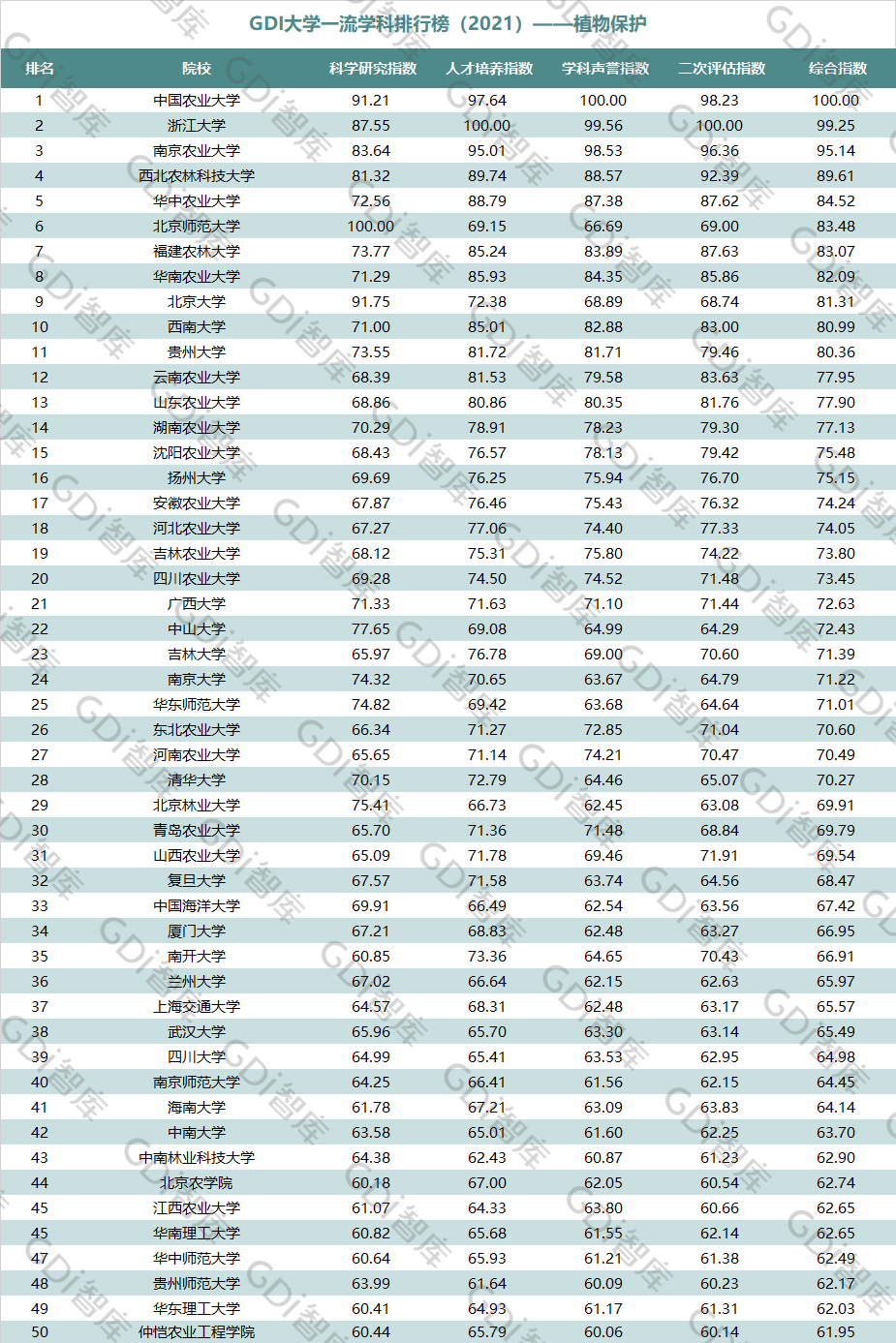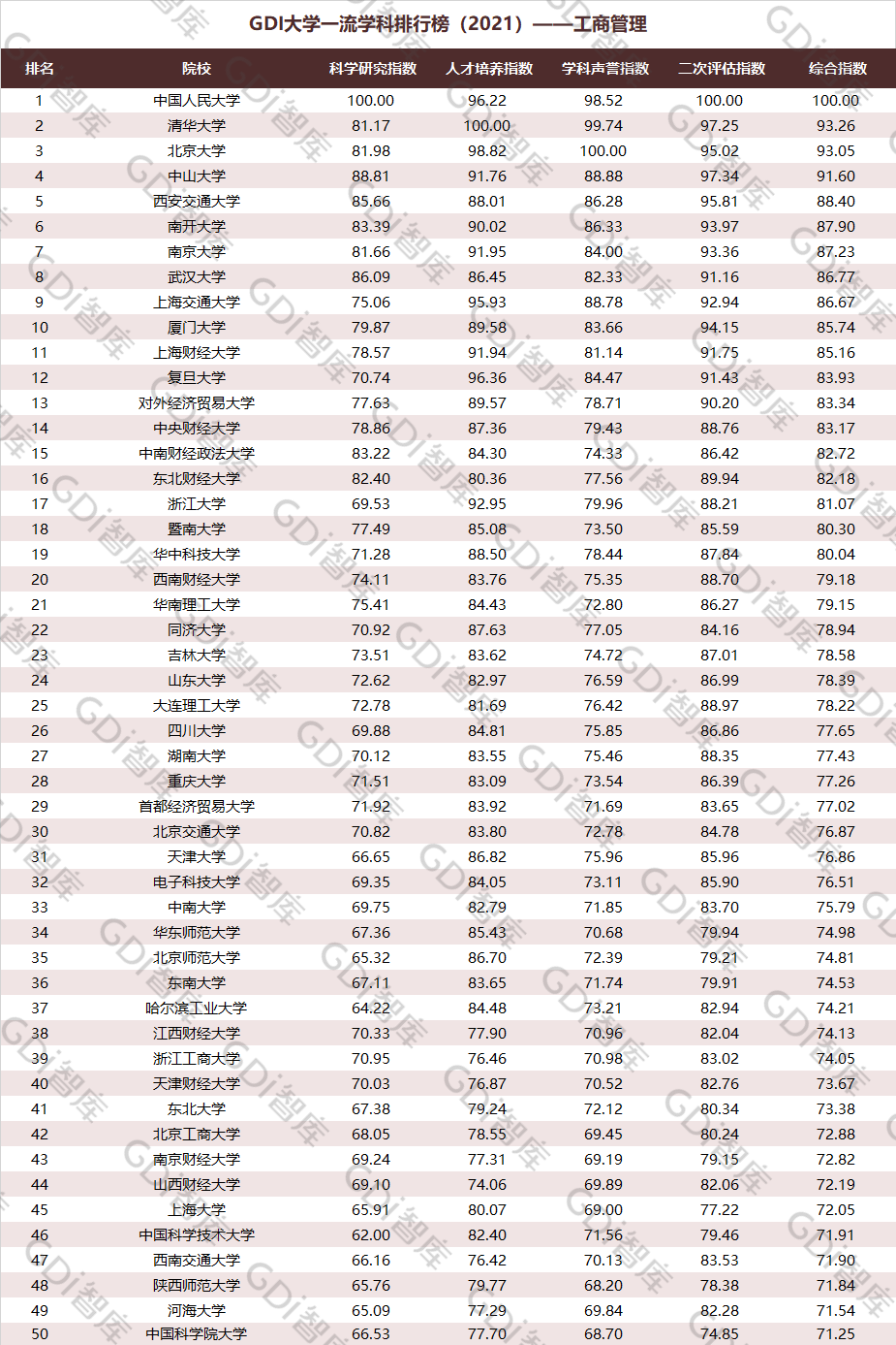 2021年6月15日,GDI智库发布“GDI大学一流学科排行榜(2021)”,通过科学研究指数、人才培养指数、学科声誉指数和二次评估指数四大一级指标科学评价518所院校的90个学科,艺术类学科不在本次评价范围。